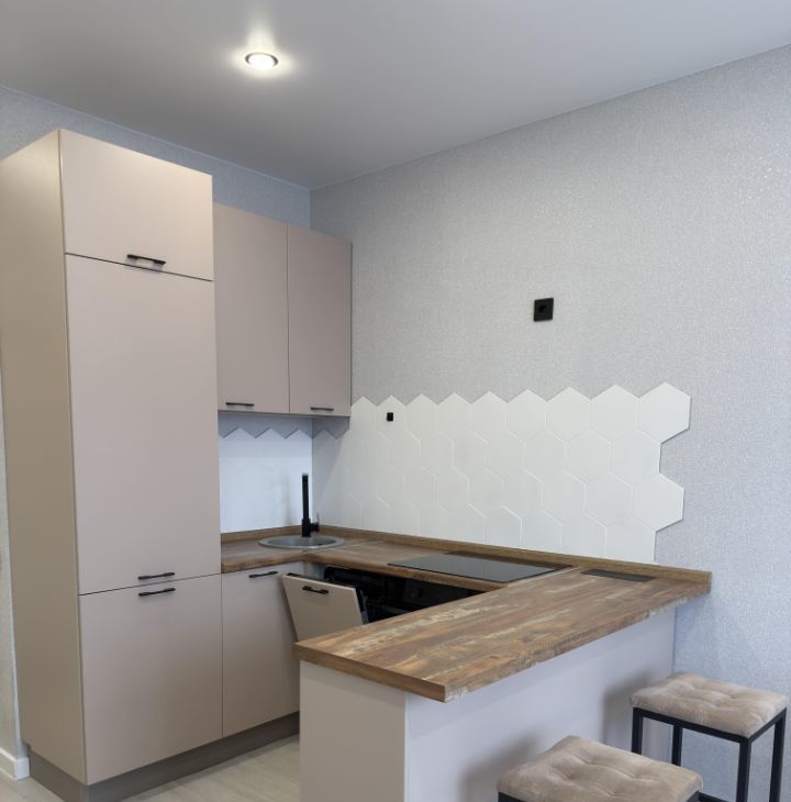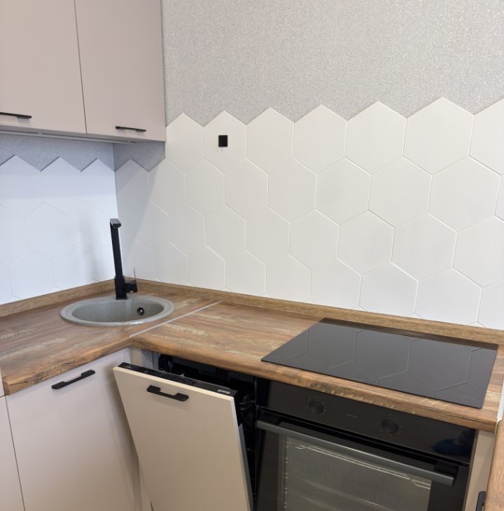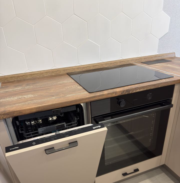 Кухня: кухонный гарнитур с современной техникой (посудомоечная машина, духовой шкаф, варочная панель, встроенный холодильник).