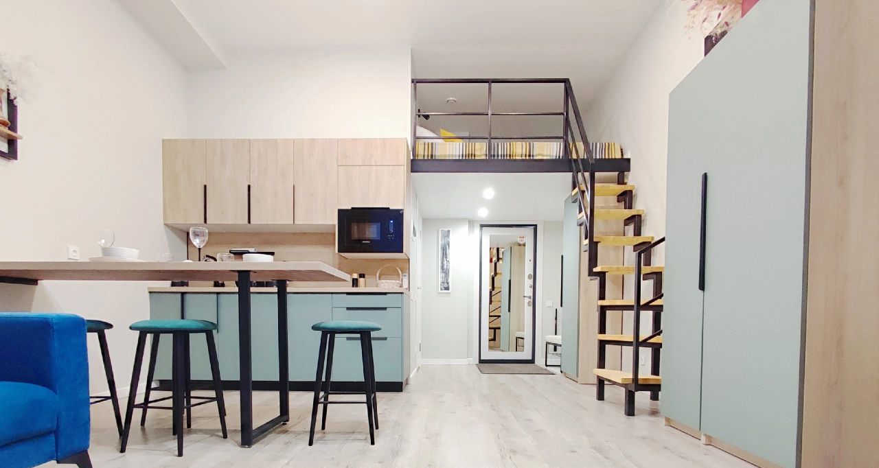 Сдаётся просторная студия со вторым ярусом в историческом центре Москвы, всего в 1 минуте пешком от станции метро Бауманская. Квартира расположена на 3 этаже 6-этажного кирпичного дома 1911 года постройки. Общая площадь — 34 кв. м, с высокими потолками 3.4 метра.