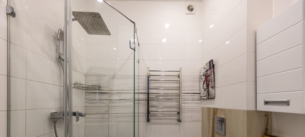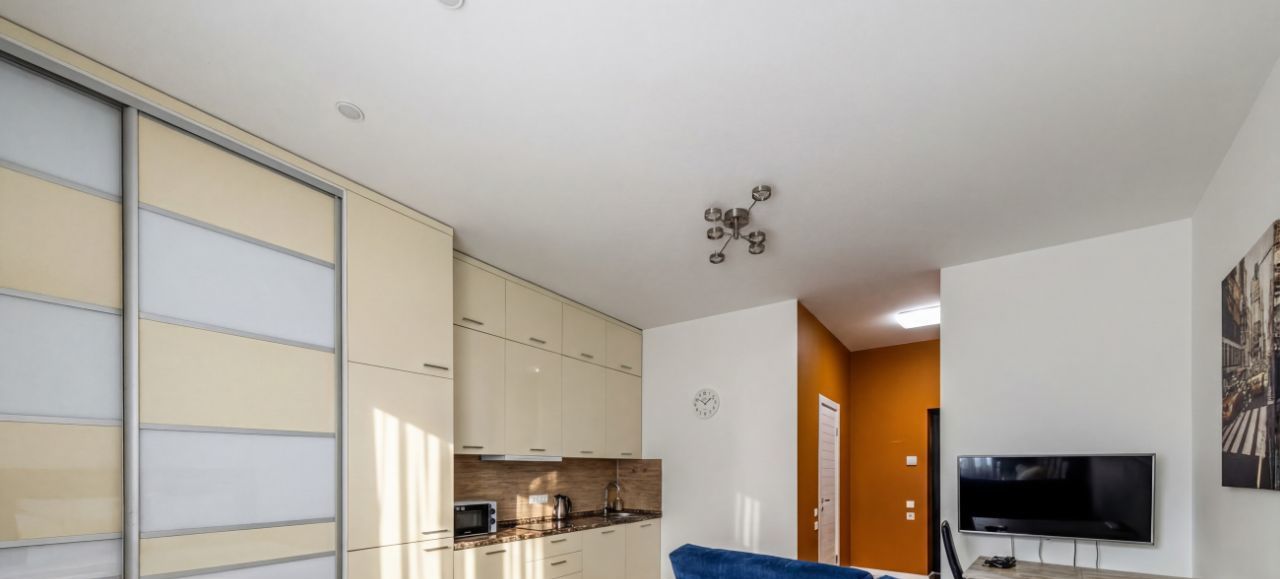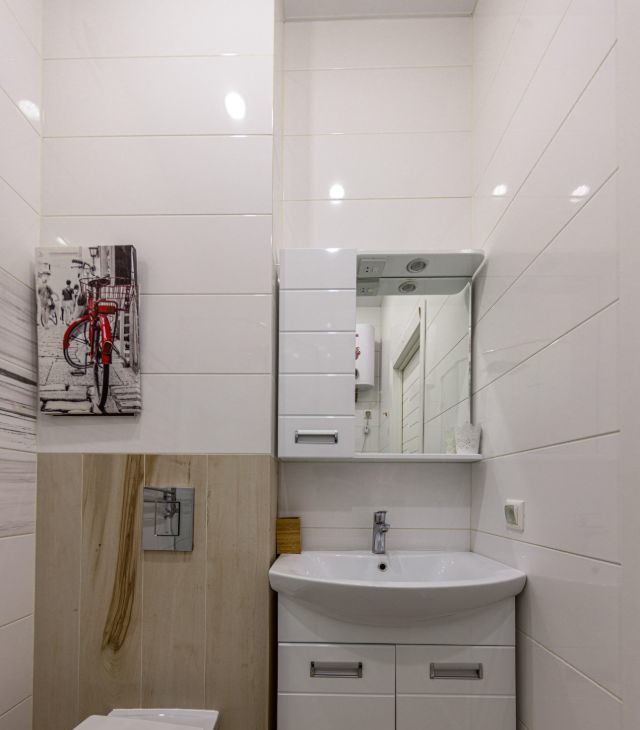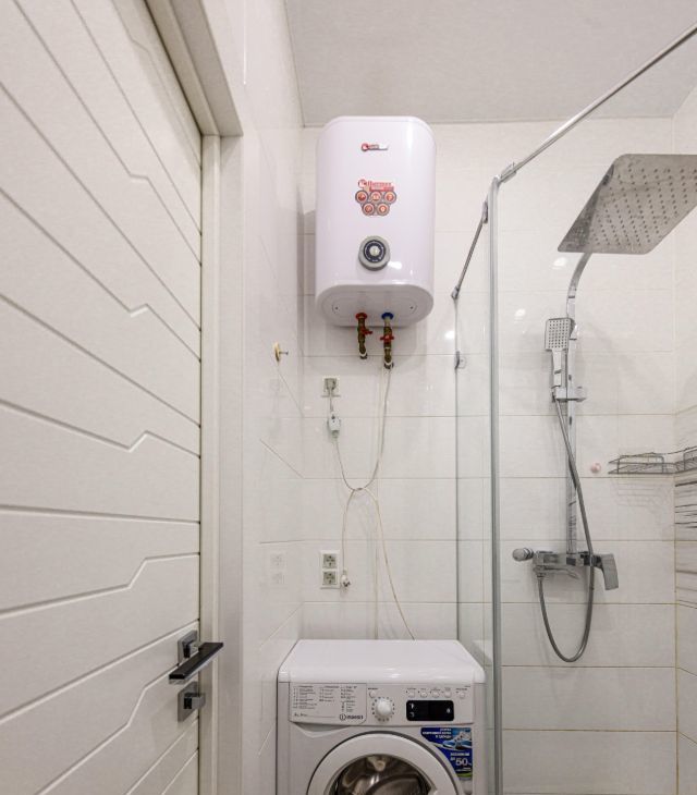 В квартире сделан качественный евроремонт, а зона кухни площадью 5 кв. м рационально организована и оснащена всей необходимой техникой: кондиционером, холодильником, посудомоечной и стиральной машинами, а также телевизором. В комнате есть мебель, создающая атмосферу уюта и функциональности. Санузел совмещенный, оборудован душевой кабиной.