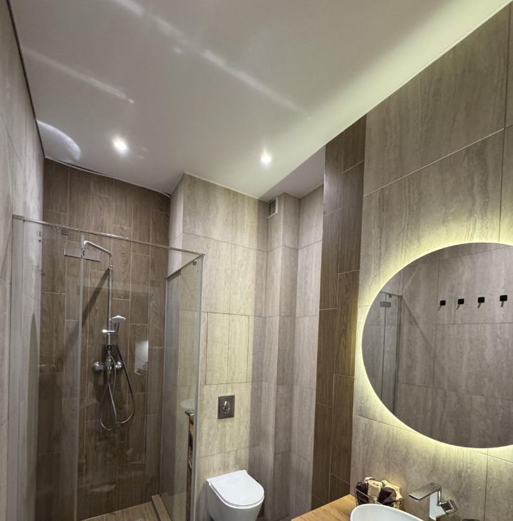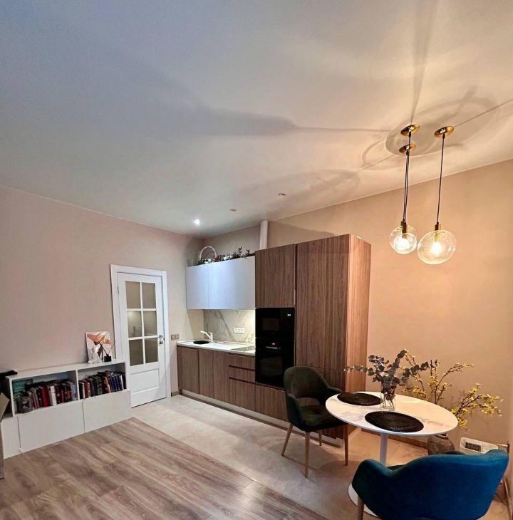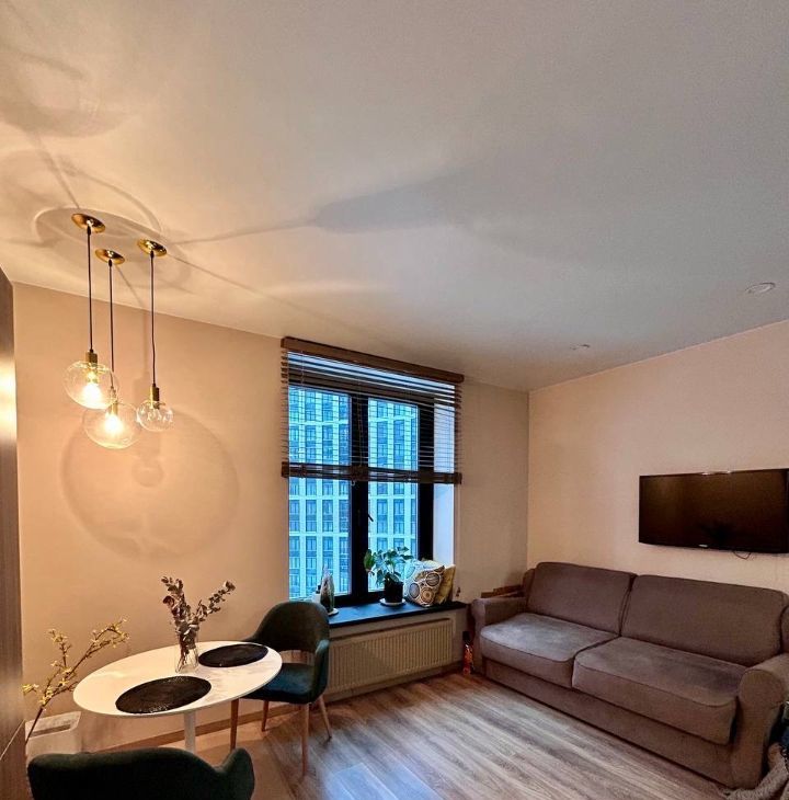 Просторная студия оборудована всем необходимым: современная мебель, качественная бытовая техника и удобный совмещенный санузел.
