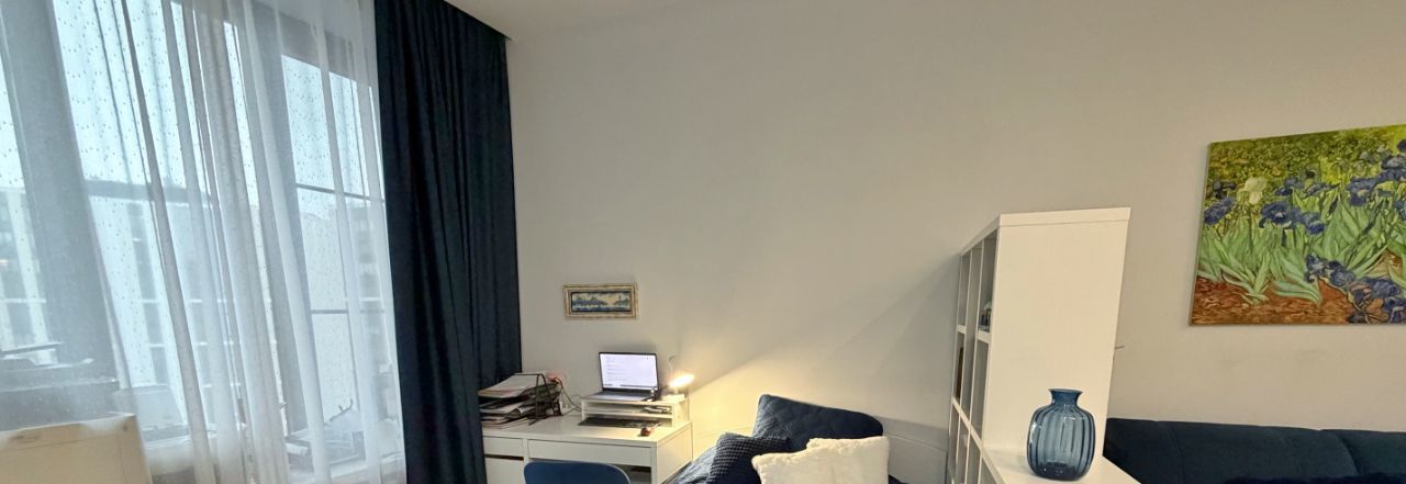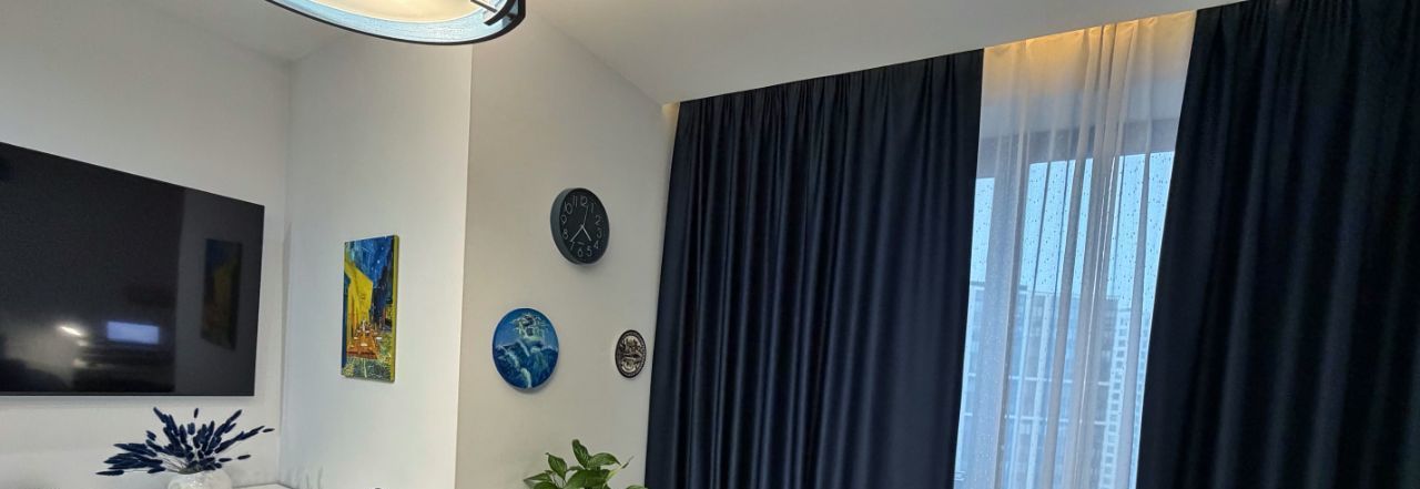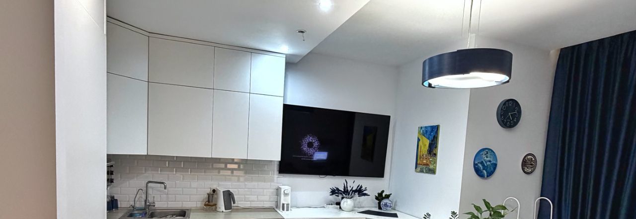 Продаются дизайнерские апартаменты-студия площадью 33,6 м² на 21 этаже. Высота потолков — 3 м. Большое окно во двор — тихо и светло.