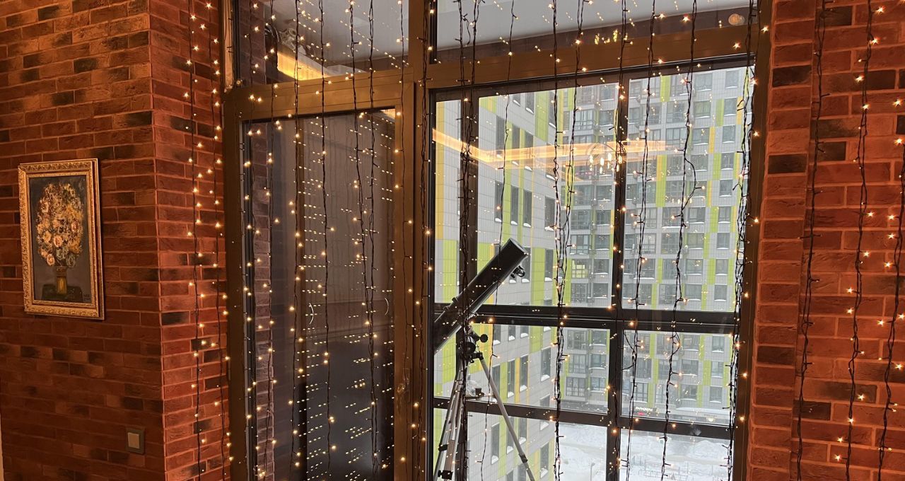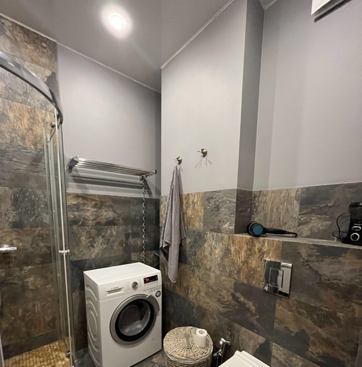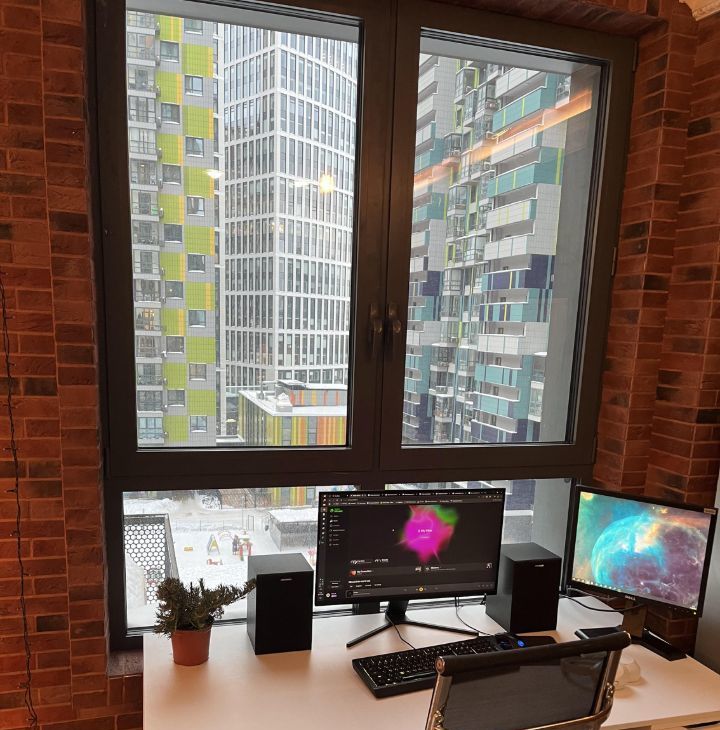 Панорамные окна, вешалка для одежды, большой встроенный шкаф, диван-кровать, кондиционер, два рабочих стола, кухня с индукционной плитой и духовкой-микроволновкой, кухонный стол, холодильник, сетевые розетки. Большой балкон с глубоким шкафом и видами во двор. В ванной: унитаз, стиральная машина, водонагреватель, душевая кабина.