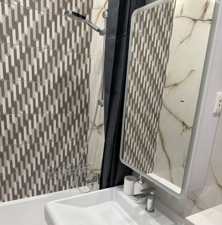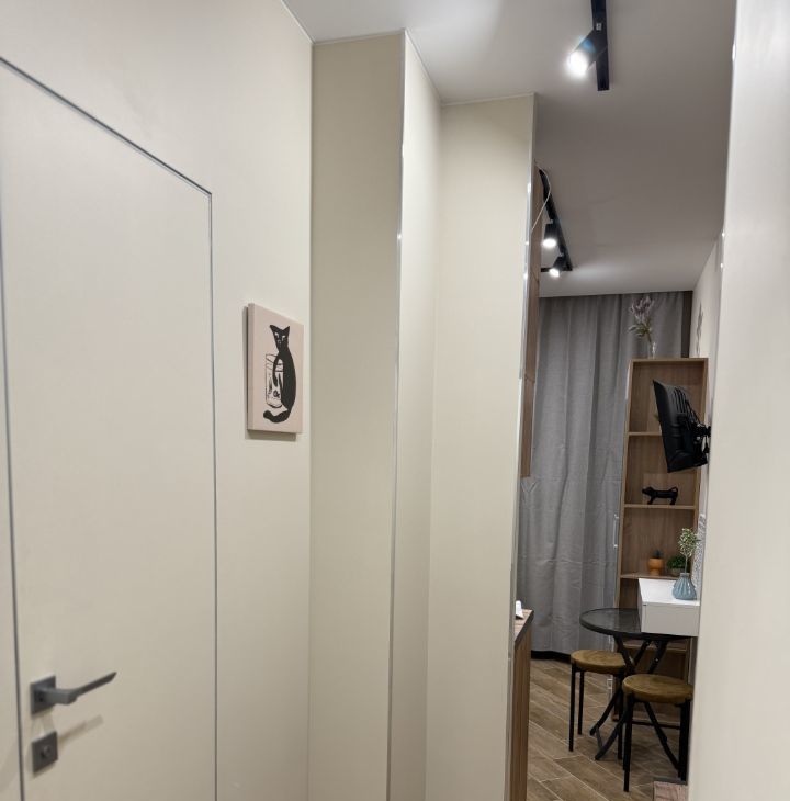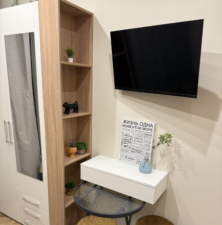 Студия оформлена с дизайнерским ремонтом и полностью меблирована, поэтому можно сразу заехать и жить. В квартире есть все необходимое для комфортной жизни: холодильник, посудомоечная и стирально-сушильная машины, микроволновка, кондиционер, телевизор. Дополнительные удобства : шторы блэкаут, цифровой замок, датчики протечки. Диван легко трансформируется в полноценную ортопедическую кровать шириной 130 см. В ванной есть бойлер для периода отключения горячей воды летом.