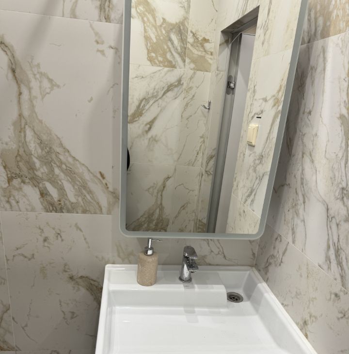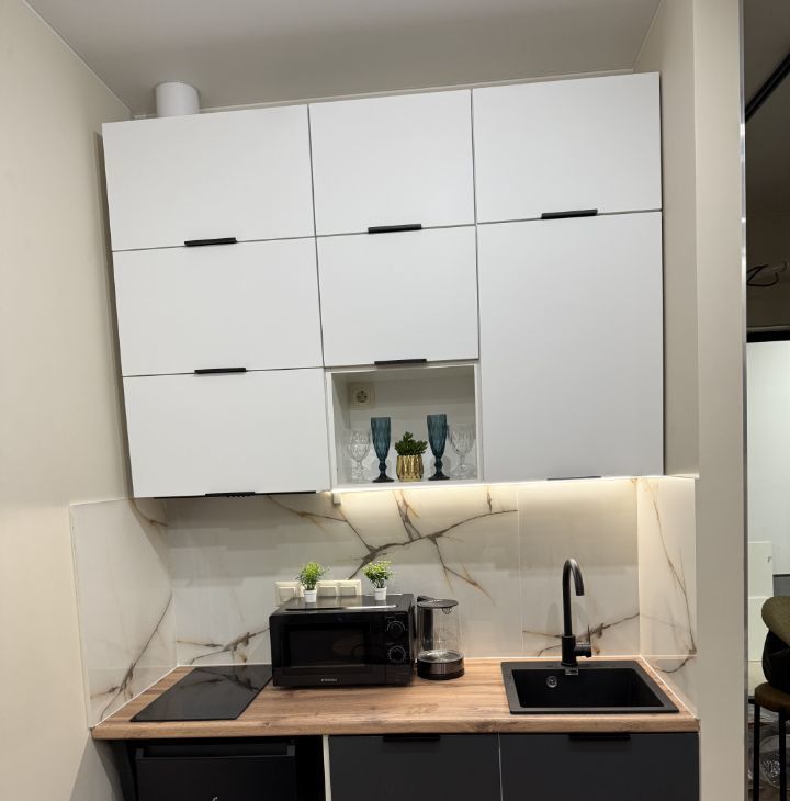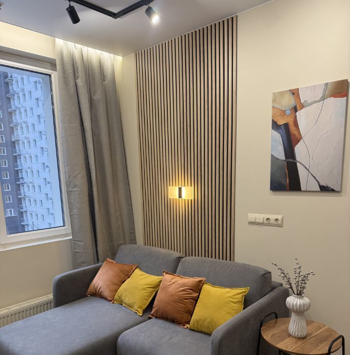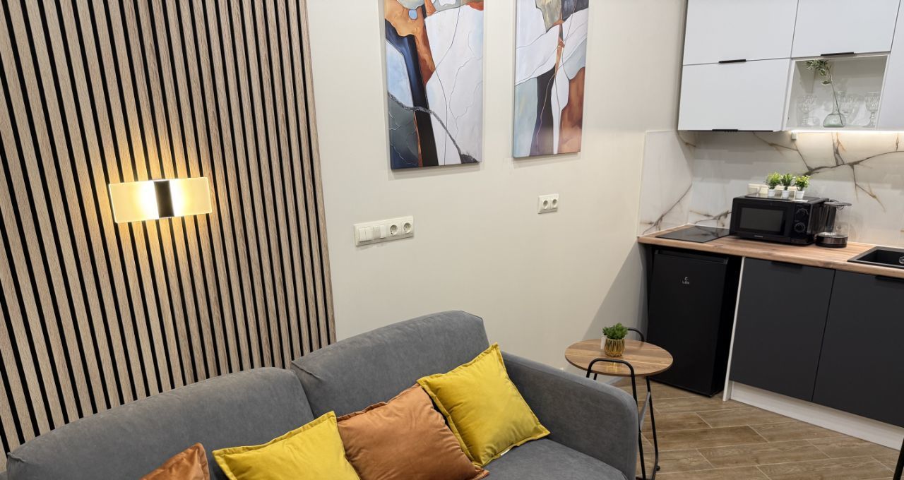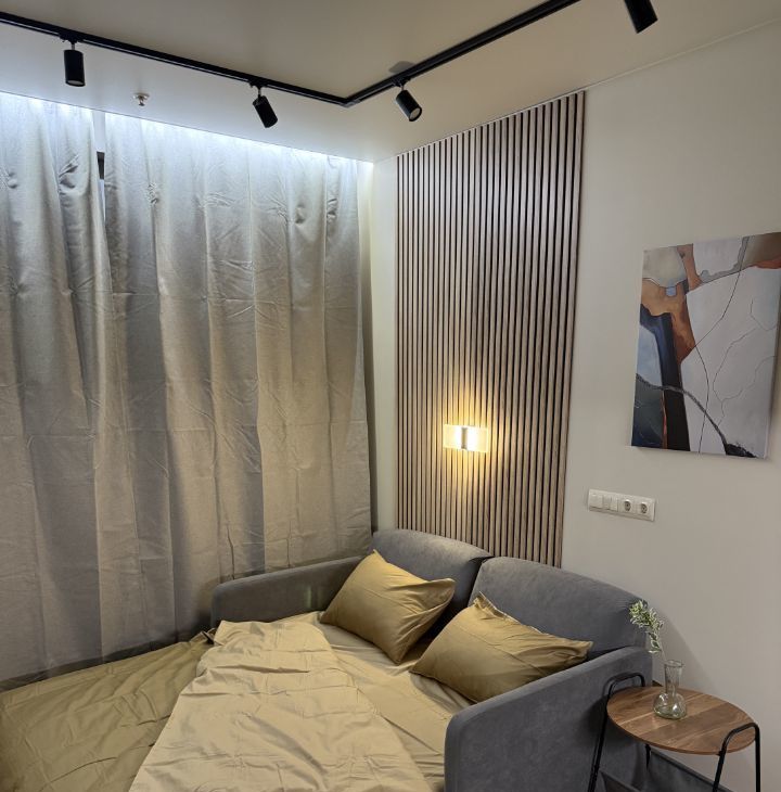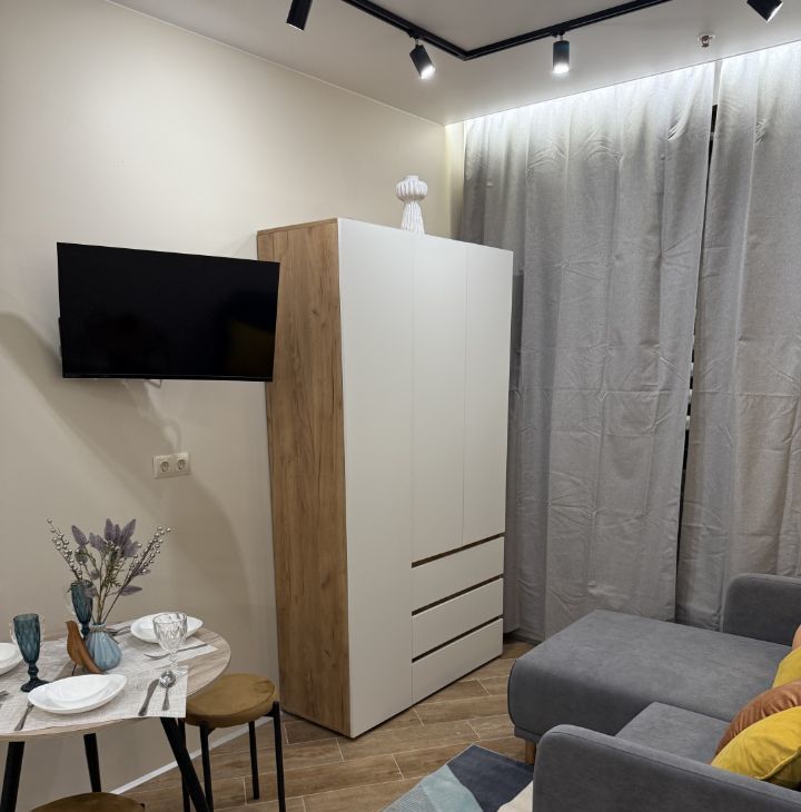 Студия оформлена с дизайнерским ремонтом и полностью меблирована, поэтому можно сразу заехать и жить. В квартире есть всё необходимое для комфортной жизни: холодильник, посудомоечная и стирально-сушильная машины, микроволновка, кондиционер, телевизор. Дополнительные удобства : шторы блэкаут, цифровой замок, датчики протечки. Угловой диван легко трансформируется в полноценную двухспальную ортопедическую кровать шириной 160 см. В ванной есть бойлер для периода отключения горячей воды летом. Окна выходят во двор, что обеспечивает тишину и чистый воздух.