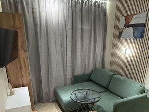 В студии сделан дизайнерский ремонт, который подчеркнет вашу индивидуальность. В комнате и на кухне есть вся необходимая мебель. На кухне удобно готовить благодаря функциональной планировке, а в жилой зоне уютно отдыхать. Для вашего комфорта установлены кондиционер, холодильник, телевизор и стиральная машина. Санузел совмещен и оборудован современной душевой кабиной.