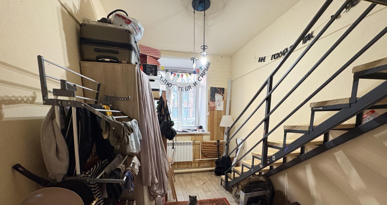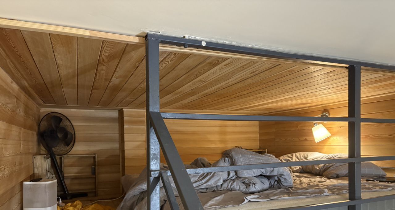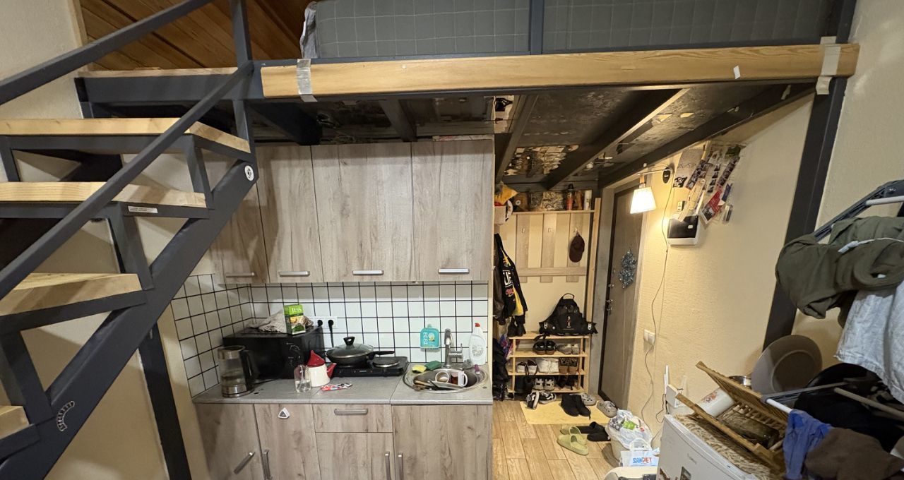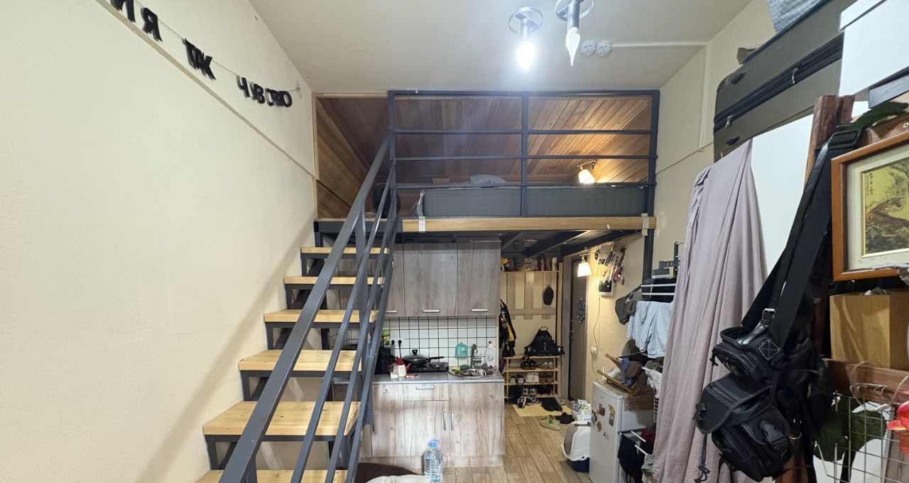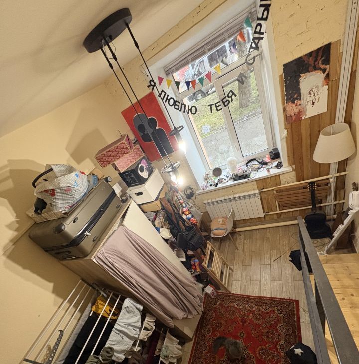 Двухэтажная студия, на втором этаже матрас, полочка, высота 150 см.