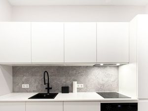 В студии есть всё необходимое для комфортной жизни: стиральная и сушильная машины Samsung, кондиционер Electrolux, бризер Smartmi, холодильник LG, большая посудомоечная машина Bosch, индукционная плита на две конфорки Bosch, вытяжка, духовка с функцией СВЧ Bosch, телевизор (диагональ 65) и саунд-бар LG.