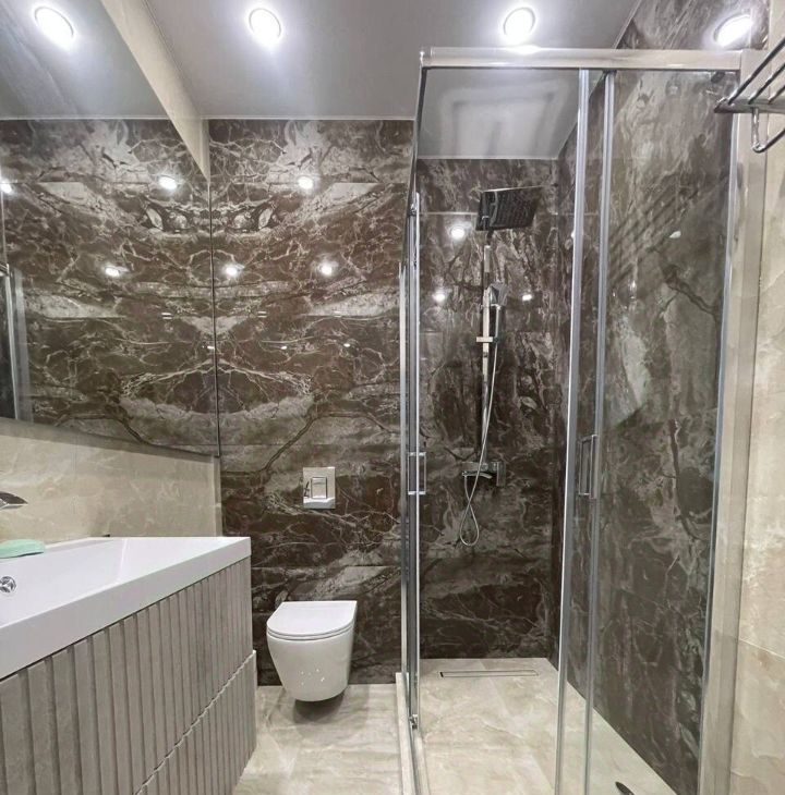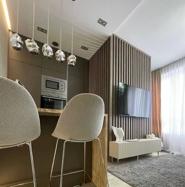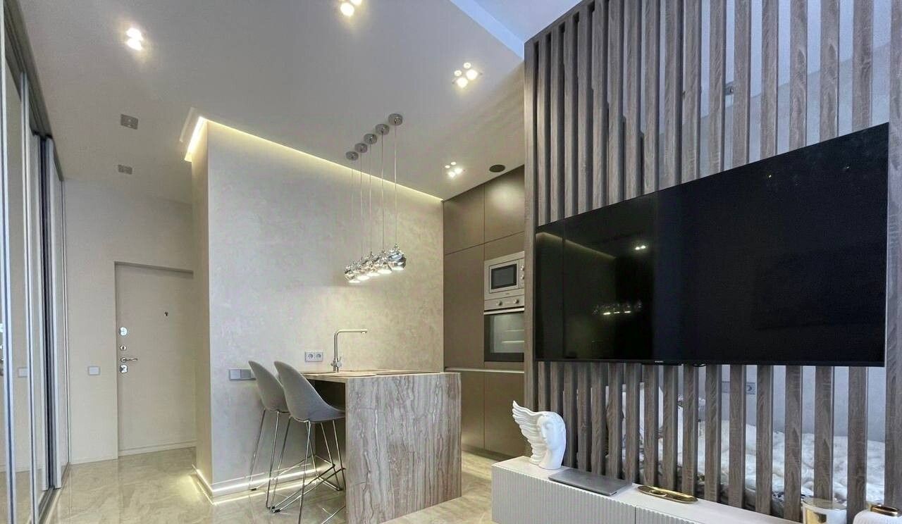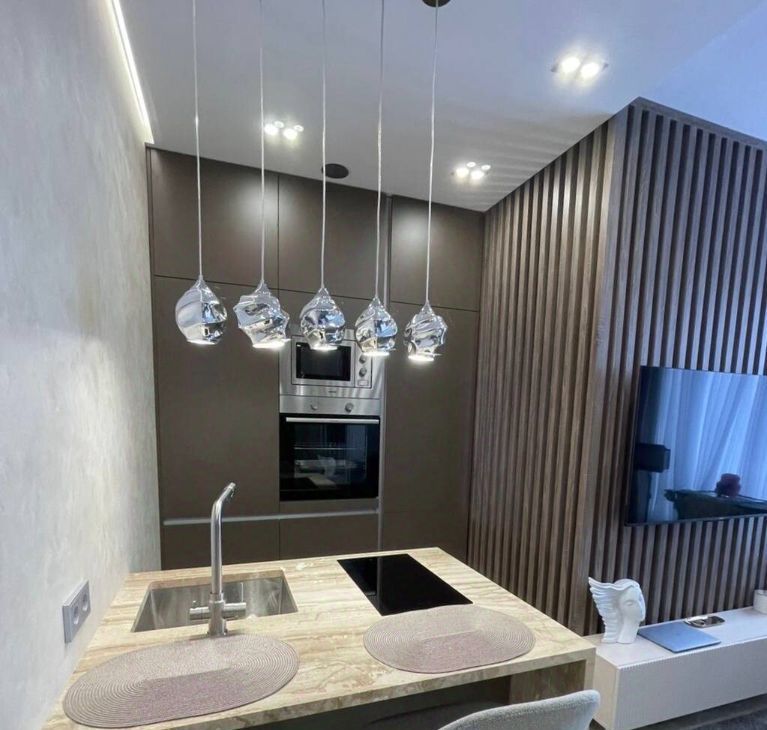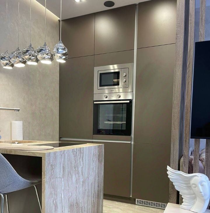 Ремонт выполнен из дорогостоящих материалов . Мебель, освещение производства Италии, Германии, Швейцарии. Столешница на островке из натурального мрамора!