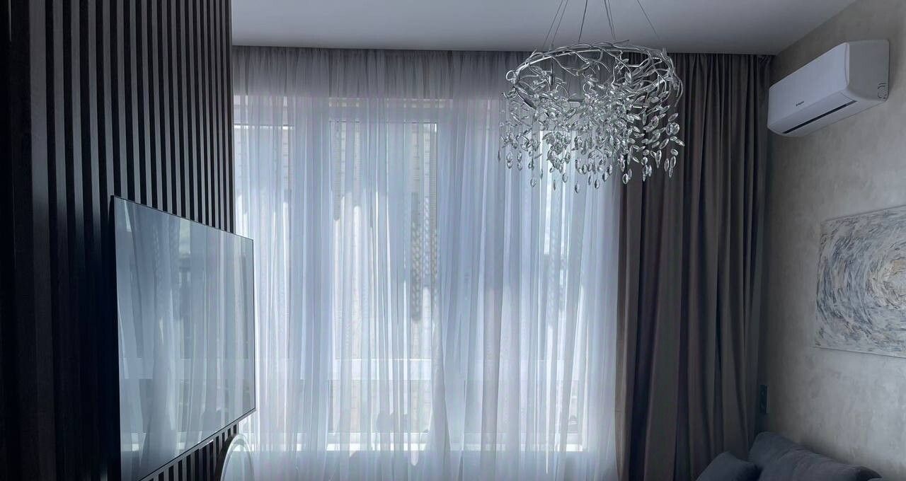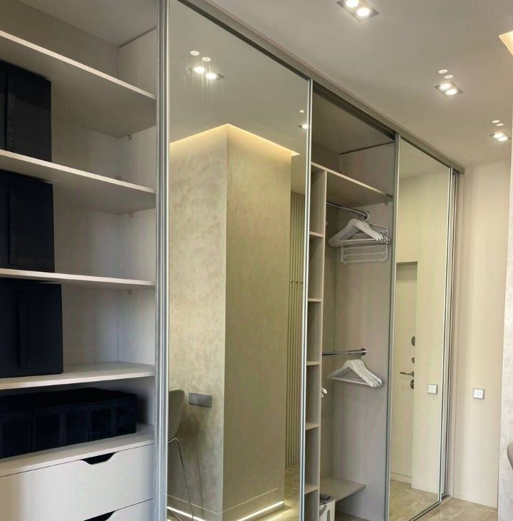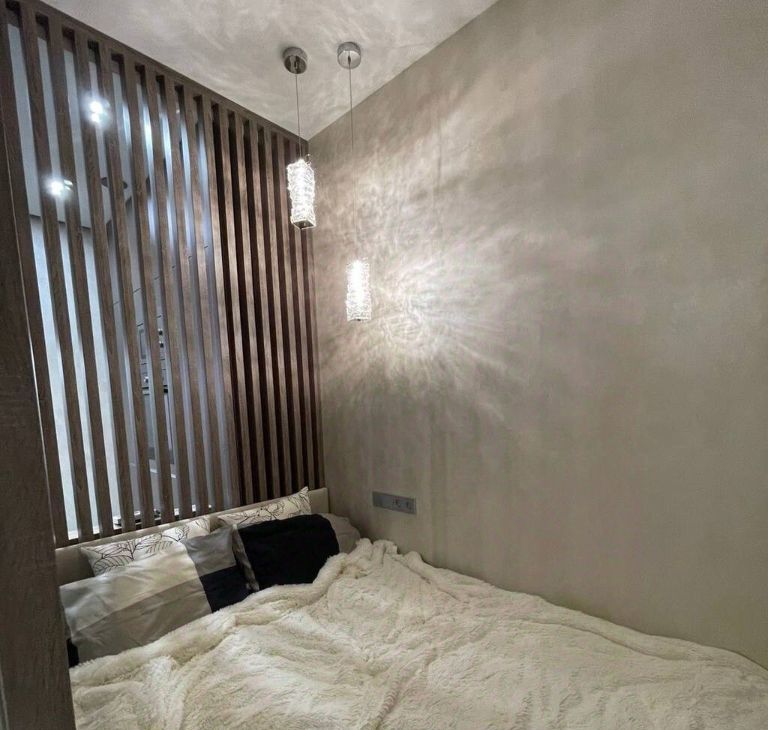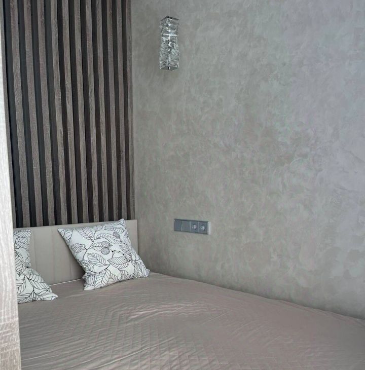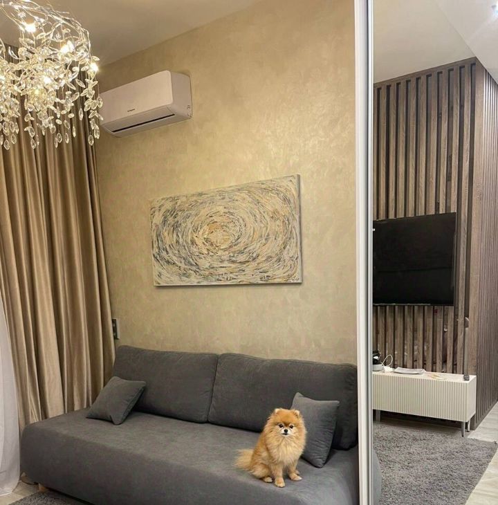 В квартире двуспальная кровать и полутороспальный диван, четырехметровый шкаф, кухня со встроенной техникой европейского производства.