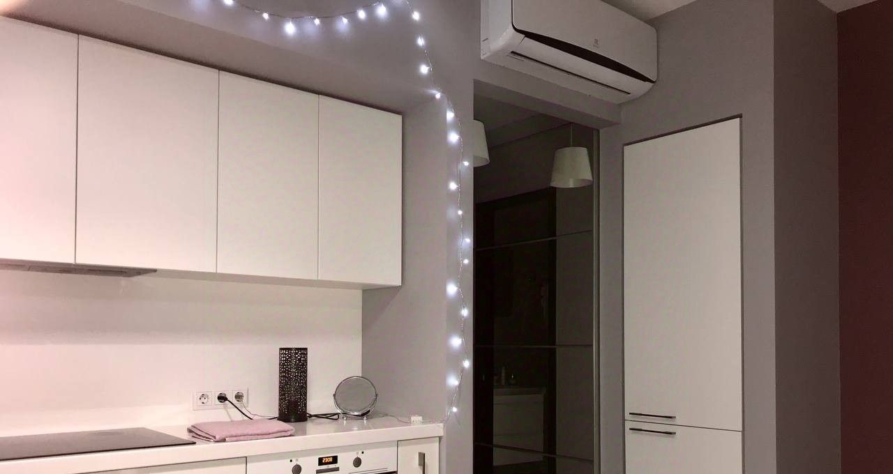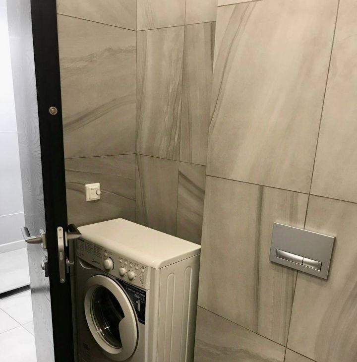 В апартаменте продуманная просторная планировка: большая комната, зона кухни со встроенной техникой Electrolux, холодильник, широкое окно с низким подоконником и видом во двор, шкаф-купе, санузел с ванной и инсталляцией.