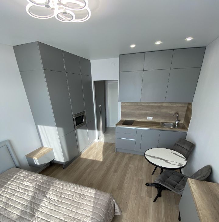Уютная студия с современным ремонтом на Большой Очаковской, 2. Светлый стильный интерьер, встроенная кухня, удобное спальное место, вместительные шкафы и продуманная организация пространства.