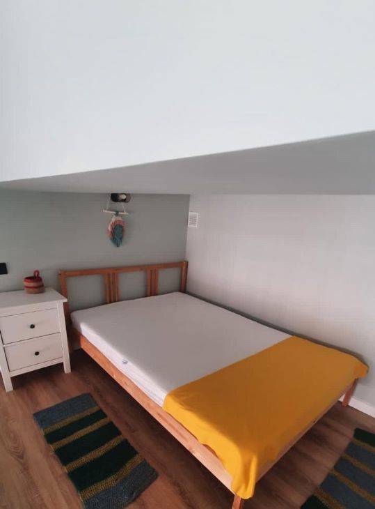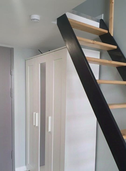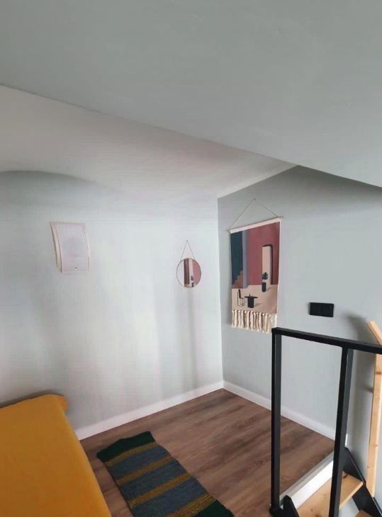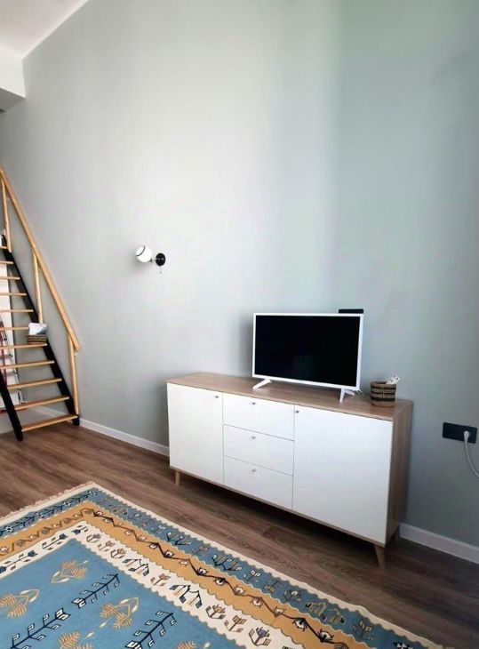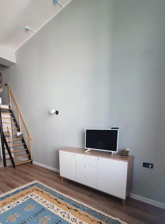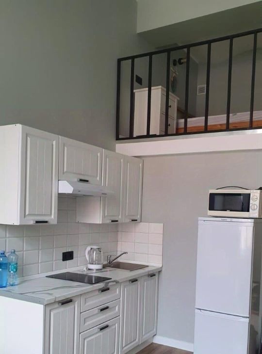 В квартире есть все для счастливой и комфортной жизни: на первом уровне расположены прихожая, санузел, гостиная и столовая зоны, кухня. На втором спальня (высокий второй уровень - человек ростом 170 встаёт в полный рост).