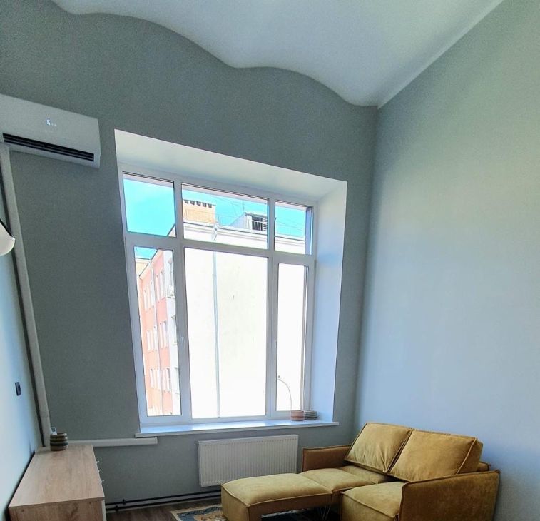 В апартаментах огромное окно со шторами, высоченные потолки, очень много света.