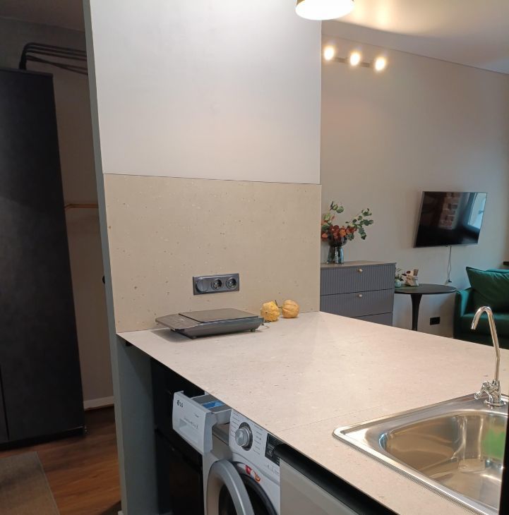 Располагается на 2 этаже 3-х этажного дома. Общая площадь 26 кв.м. Окна выходят во двор. Студия полностью готова для комфортного проживания. В ней есть все необходимое: кровать с подъёмным механизмом, телевизор, комод, шкаф, кондиционер, стиральная машина, микроволновая печь, электрическая плитка, бойлер.