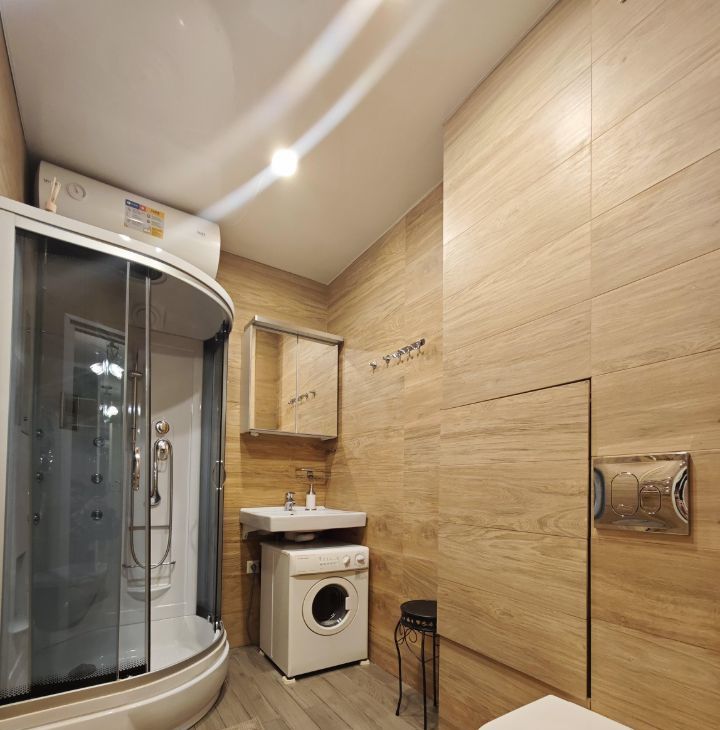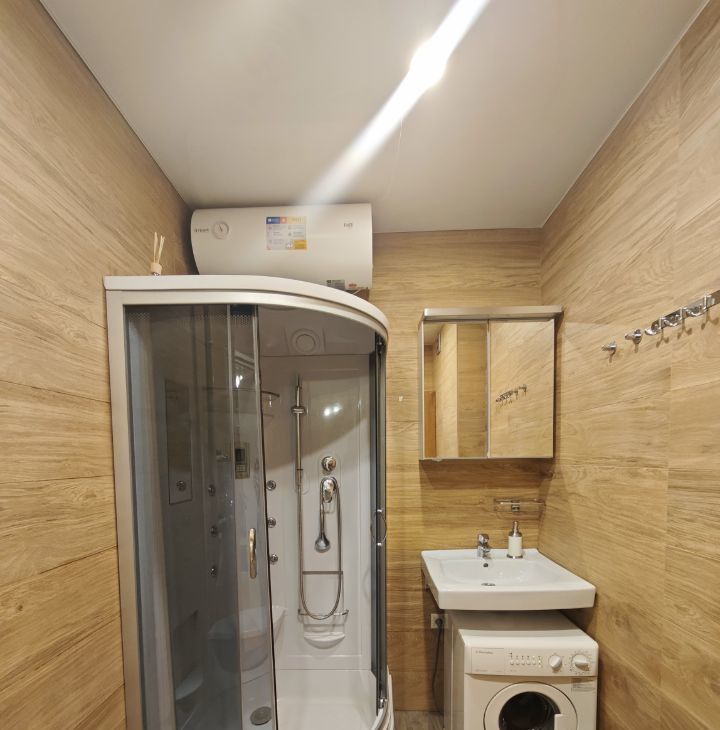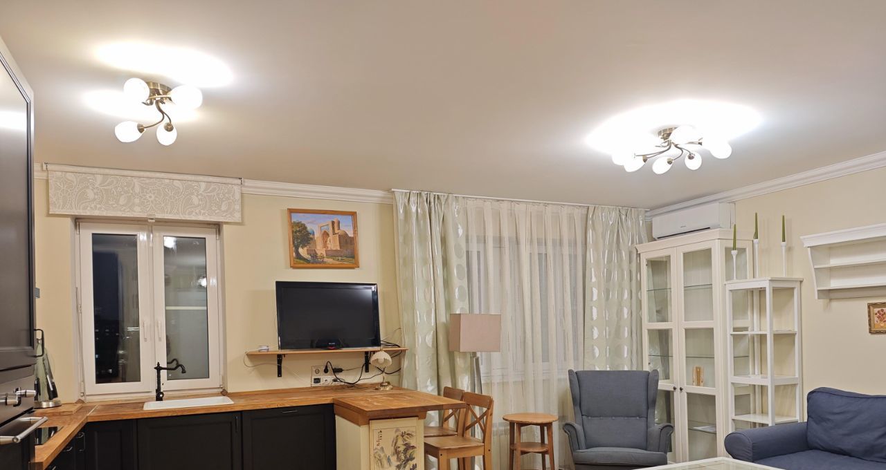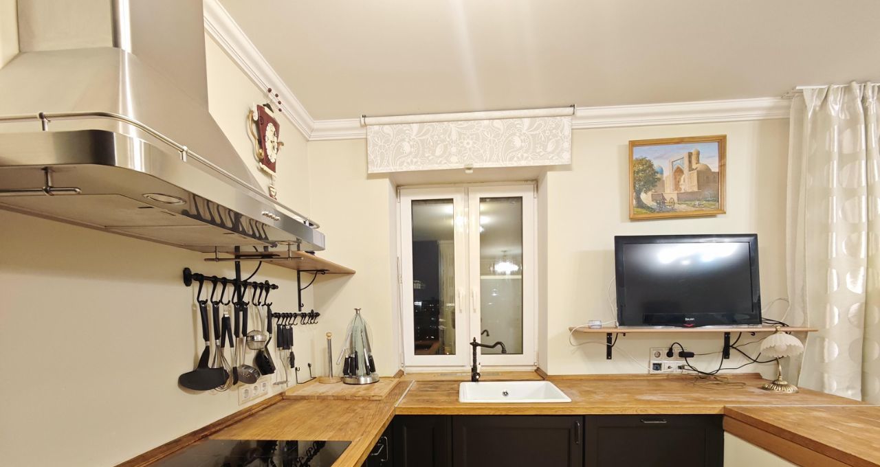 Вся техника: варочная панель, встроенный холодильник, духовой шкаф, посудомойка (60 см), кондиционер, бойлер, телевизор.