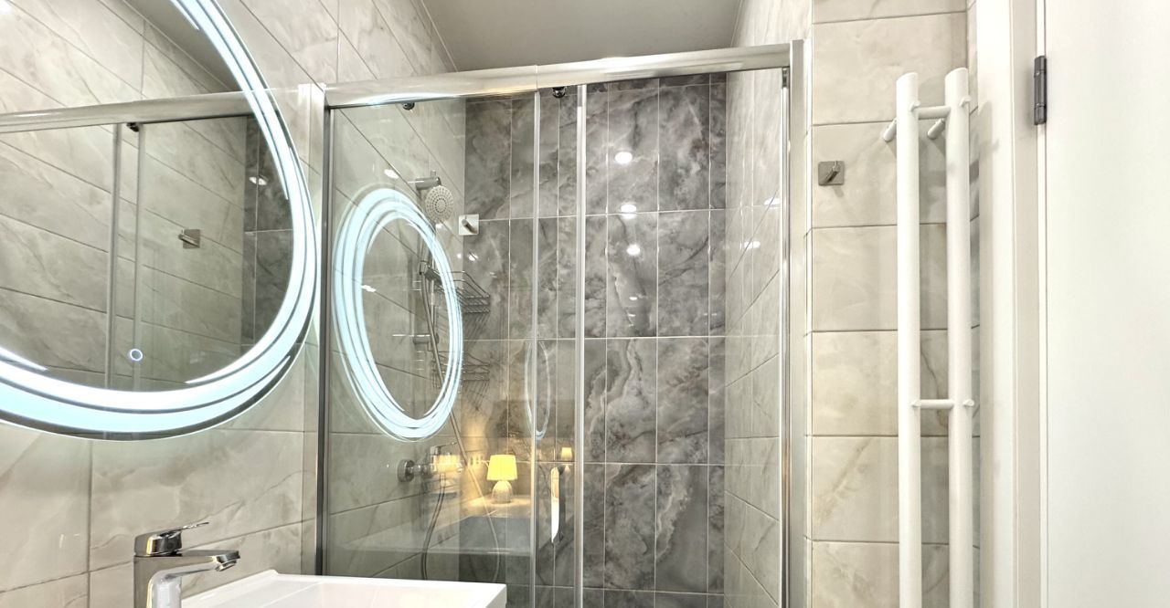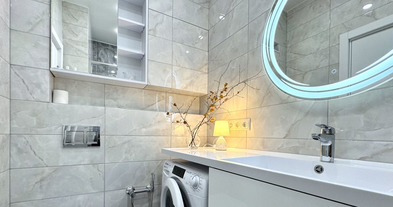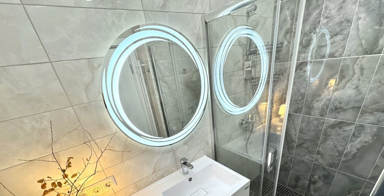 В ванной комнате установлена душевая кабина, стиральная машина с сушкой, подвесной унитаз, гигиенический душ, удобная раковина с тумбой, зеркало с подсветкой, электрический полотенцесушитель, шкафчик для мелочей.