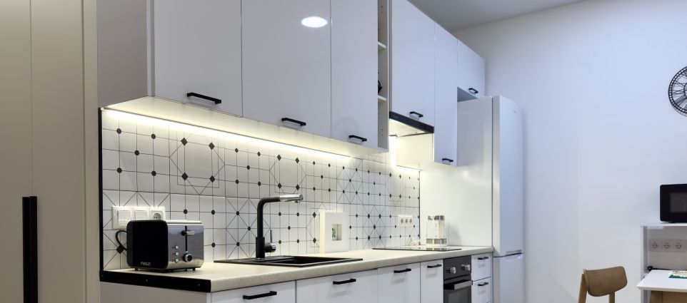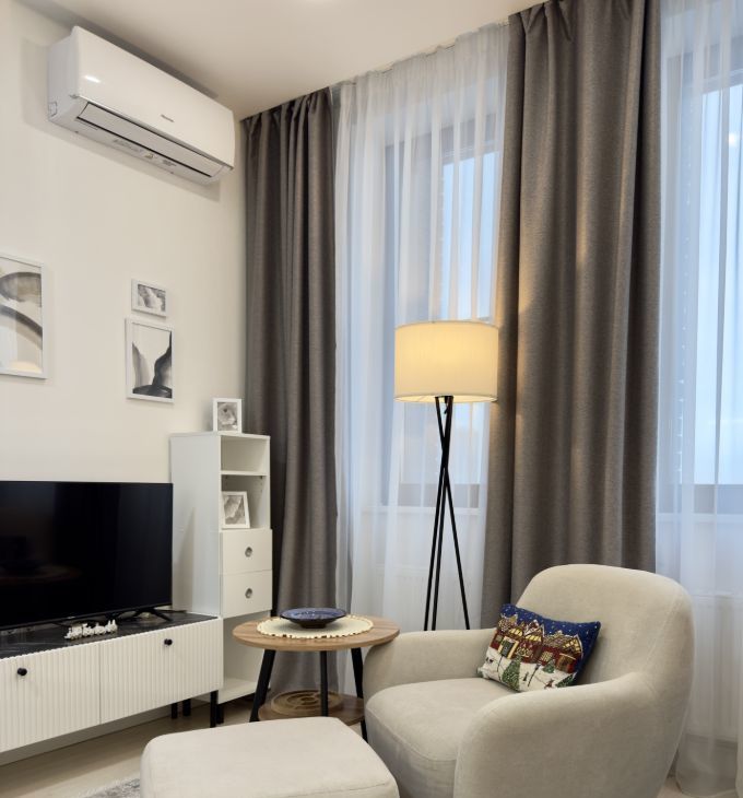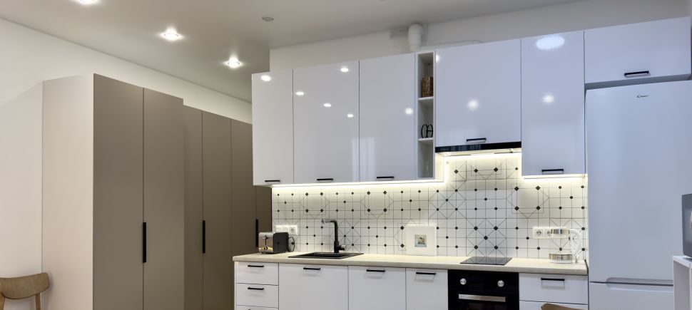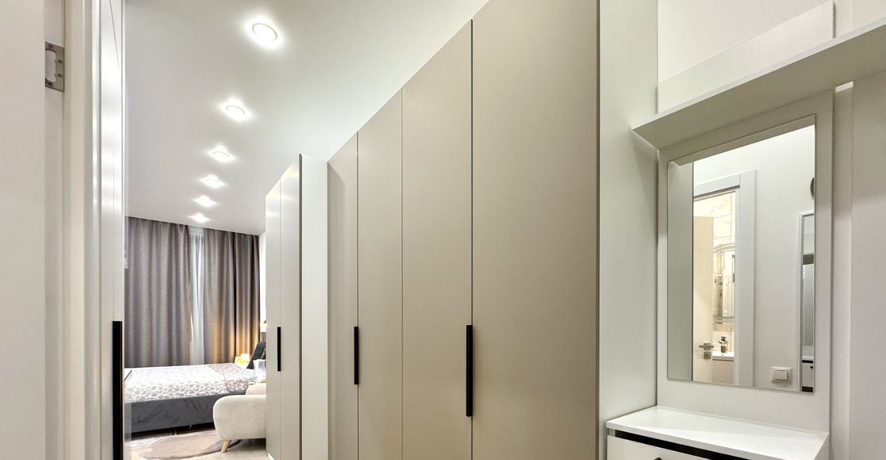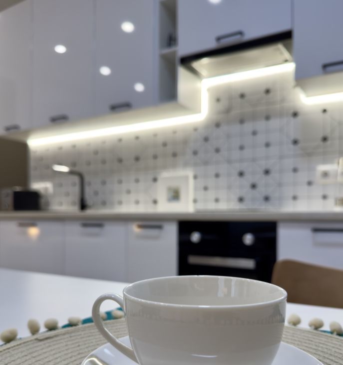Квартира полностью укомплектована: встроенная кухня (системы хранения, варочная панель, духовой шкаф, вытяжка, холодильник, посудомоечная, микроволновка, электрический чайник, тостер), телевизор, кондиционер, вертикальный пылесос.