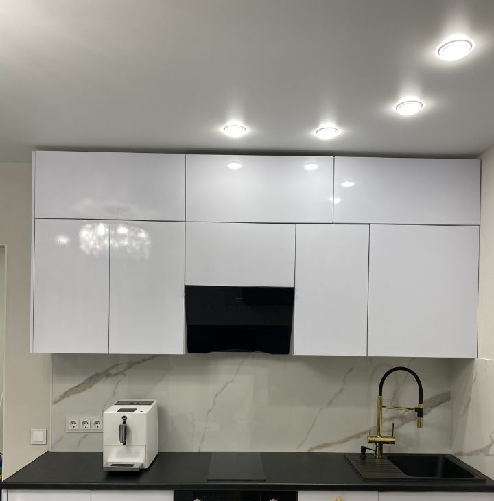 Микроволновая печь установлена внутри кухонного гарнитура.