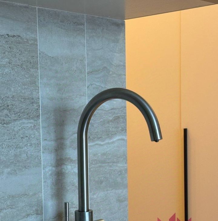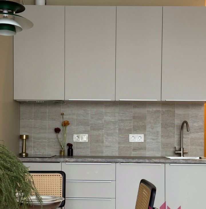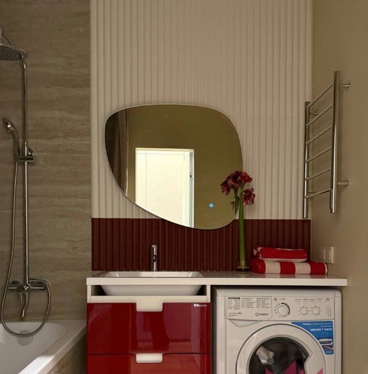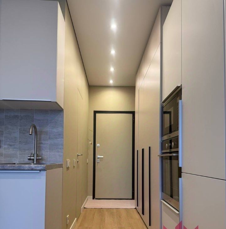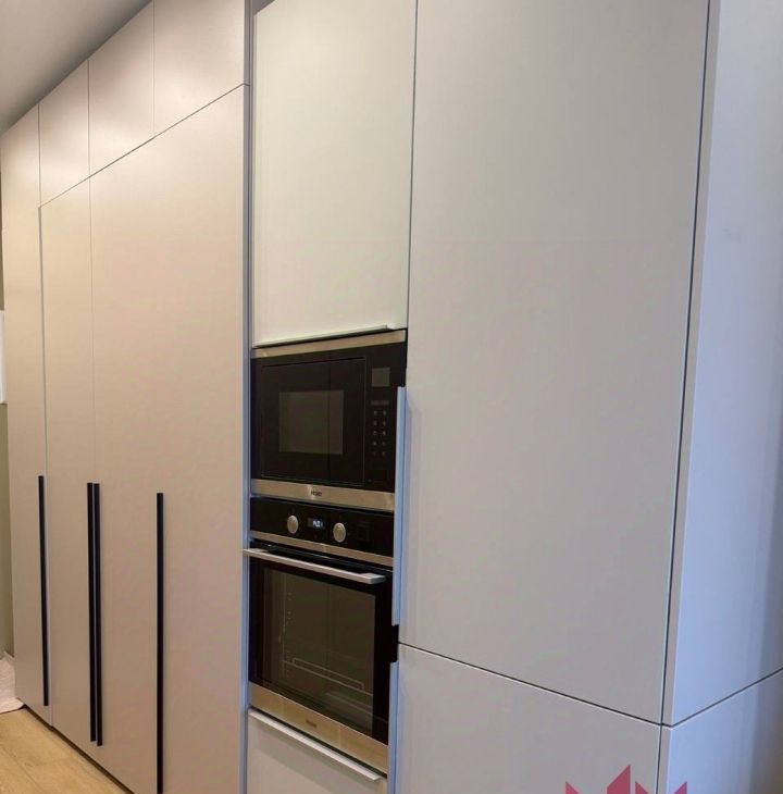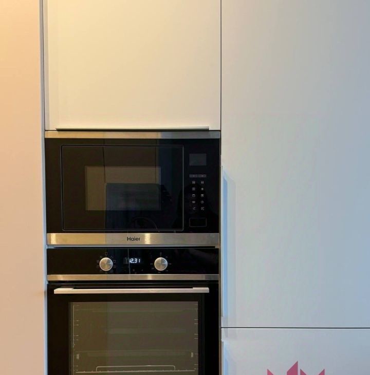 Вся необходимая новая техника: холодильник, варочная панель, духовой шкаф, посудомоечная машина, стиральная машина, микроволновка, вытяжка и кондиционер.