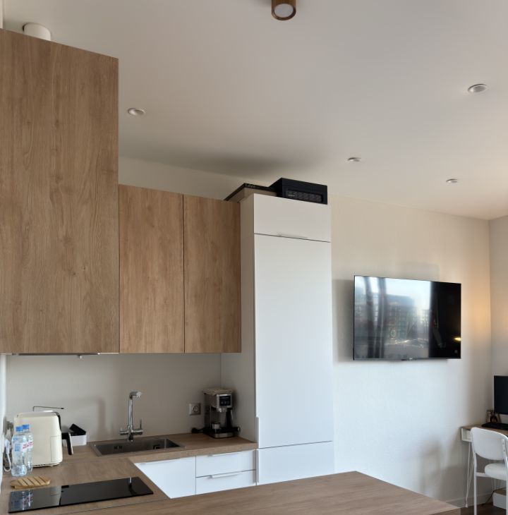 2) кухня: барная стойка и мягкие стулья, вместительный холодильник, электрическая плита и вытяжка, кофемашина, аэрогриль, чайник, система очистки воды, вся необходимая посуда;