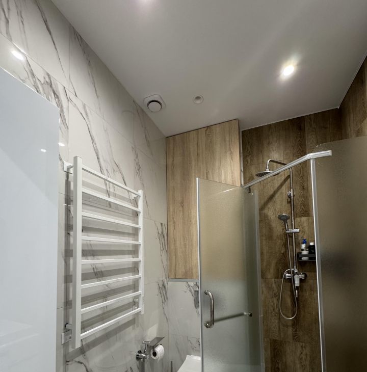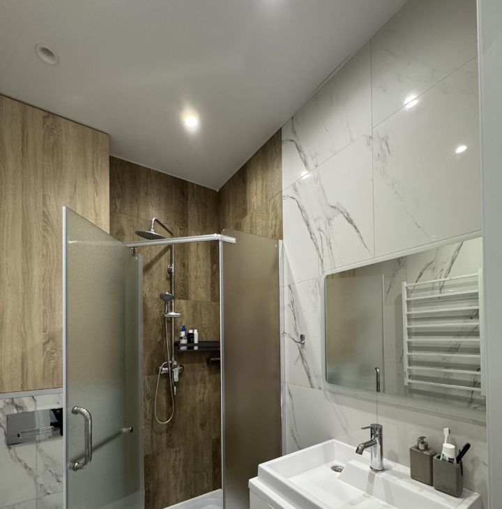 4) совмещенный санузел: просторная душевая, современный полотенцесушитель, шкаф, тумба, раковина и стиральная машина с сушилкой.