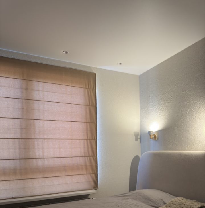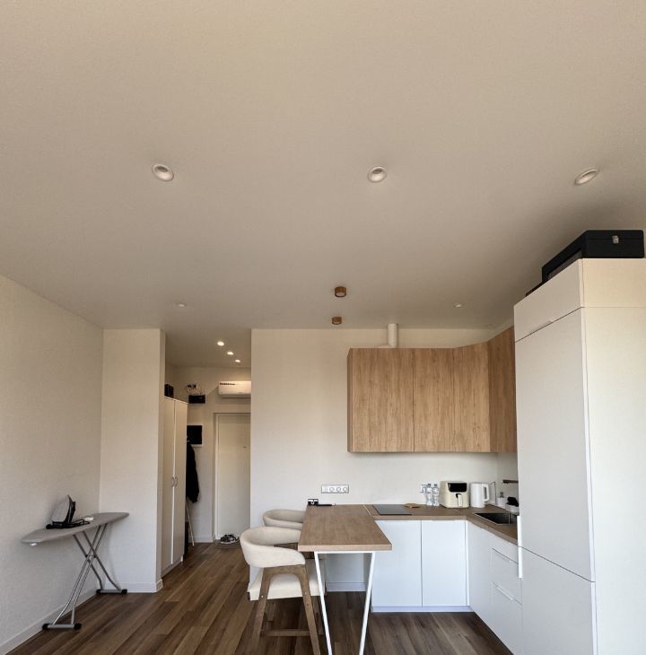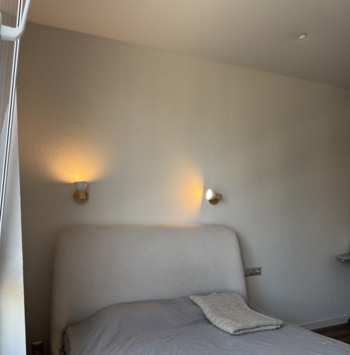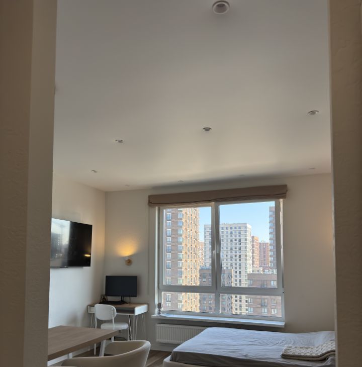 1) спальная зона: большая кровать (букле) и качественный матрас, Smart TV, рабочее место, гладильная доска и утюг, продуманное освещение и blackout шторы;