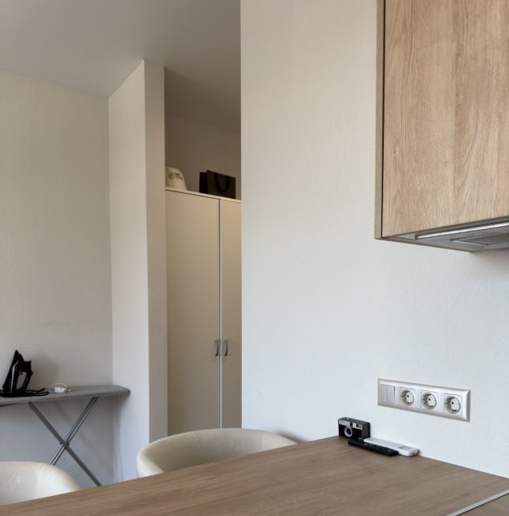 3) прихожая: просторный шкаф, мягкий пуф, напольная вешалка, роутер и новый кондиционер;