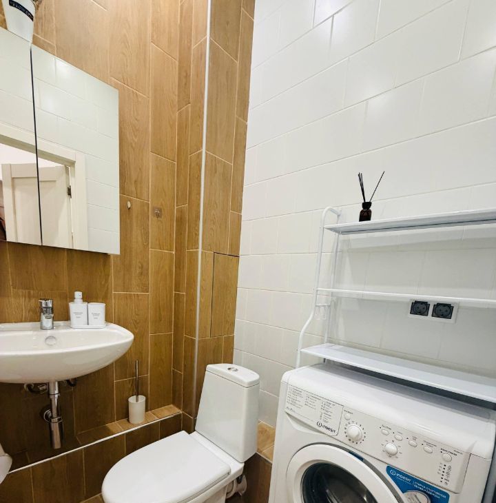Ванная, кухня. Есть кондиционер, стиральная машина, кондиционер, микроволновка.