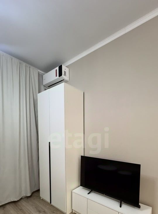 В студии высокие потолки 2,95м. На полу ламинат и плитка у зоны кухни. Два вместительных высоких шкафа, которых сполна хватит для хранения Ваших вещей. Дополнительно тумба под ТВ и прикроватная тумба.