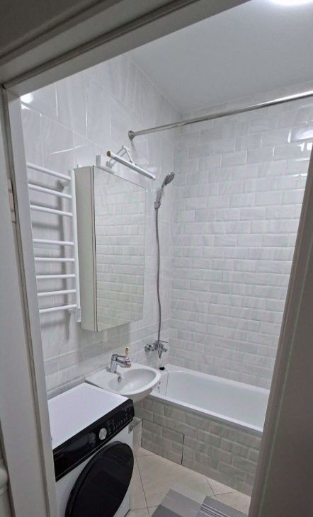 Есть вся необходимая техника: холодильник, микроволновая печь, электрическая плита, стиральная машина и телевизор. Санузел совмещенный.
