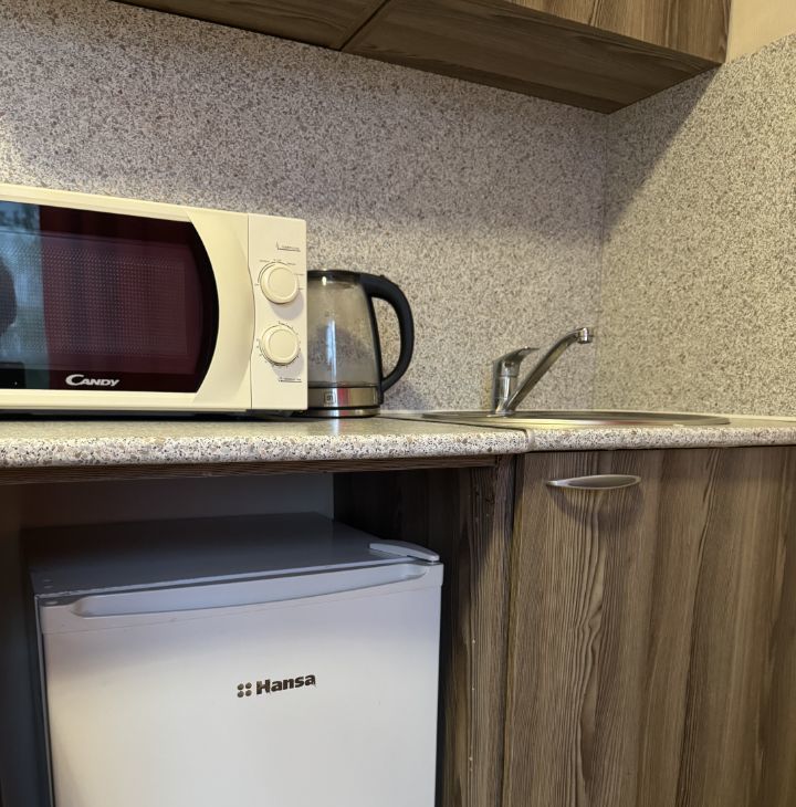 Установлена стиральная машина, холодильник, электрическая плита, микроволновая печь, телевизор.