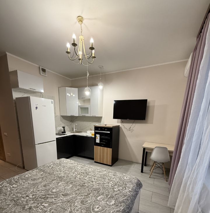 Сдаётся уютная студия площадью 26 кв. м в современном монолитном доме 2020 года постройки. Квартира находится на 9-м этаже 23-этажного здания. Высота потолков — 3 метра. До метро всего 11 минут пешком, что удобно для ежедневных поездок.