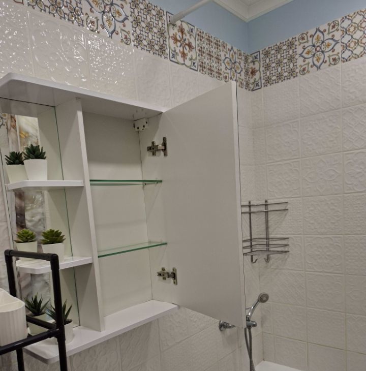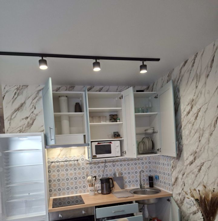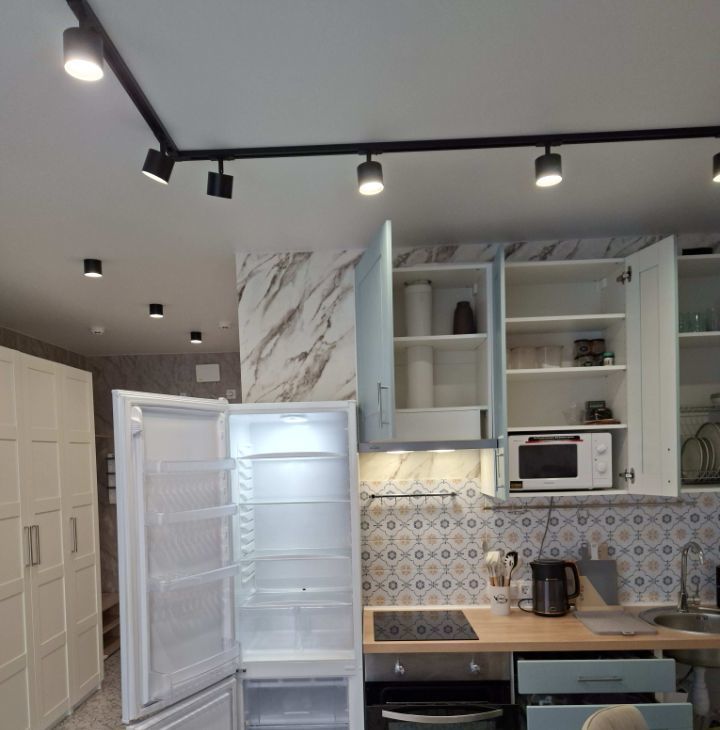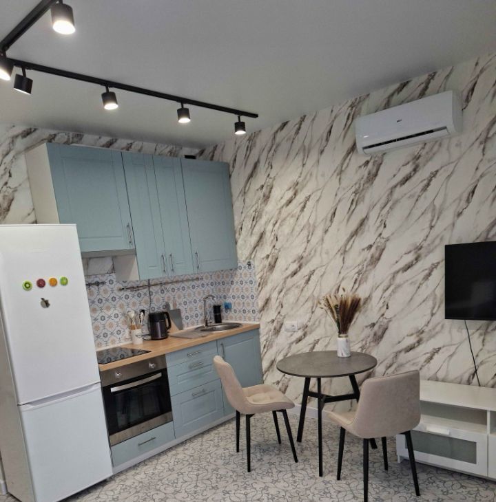 В квартире есть все необходимое для комфортного проживания: современная мебель на кухне и в комнате, а также полный комплект техники — кондиционер, холодильник, телевизор и стиральная машина. Просторная кухня площадью 27,5 кв. м объединена с жилым пространством, имеется стеклокерамическая плита на 3 комфортного и духовой шкаф. Санузел совмещенный и оборудован ванной. Окна выходят во двор, поэтому в квартире тихо и спокойно.