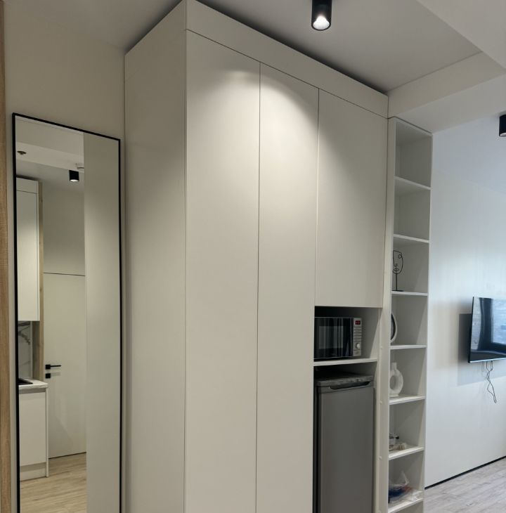 — оборудованная кухня (холодильник, СВЧ, посуда, столовые приборы)