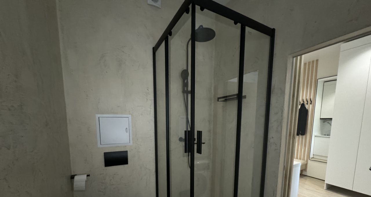 Санузел совмещённый, душевая зона с тропическим душем.