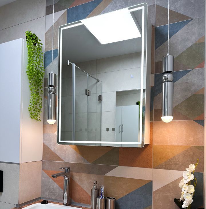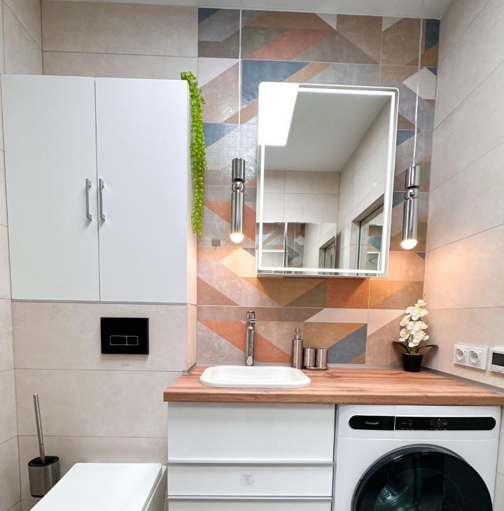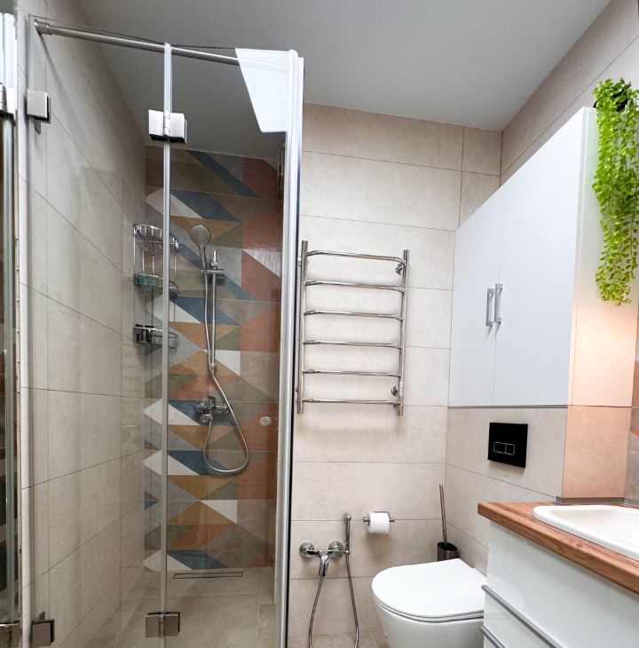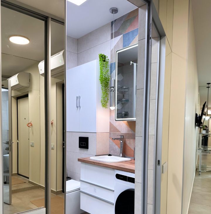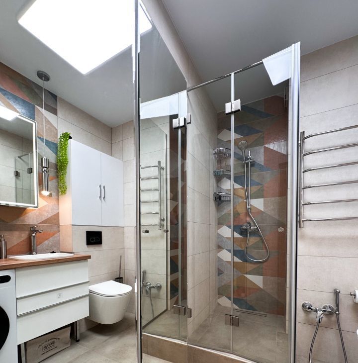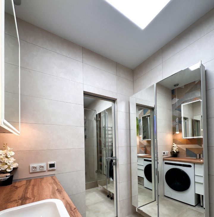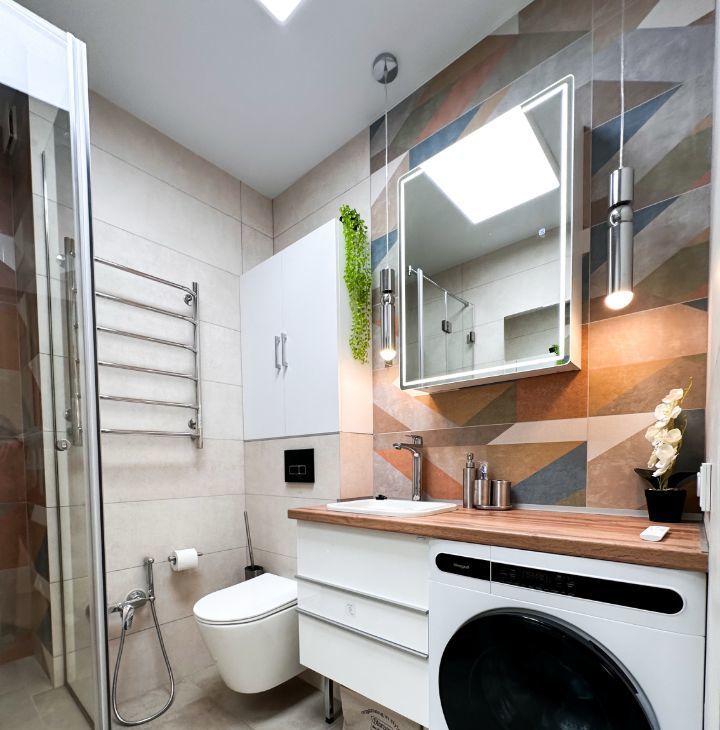 — Ванная: душевая кабина, стиральная машина, зеркало