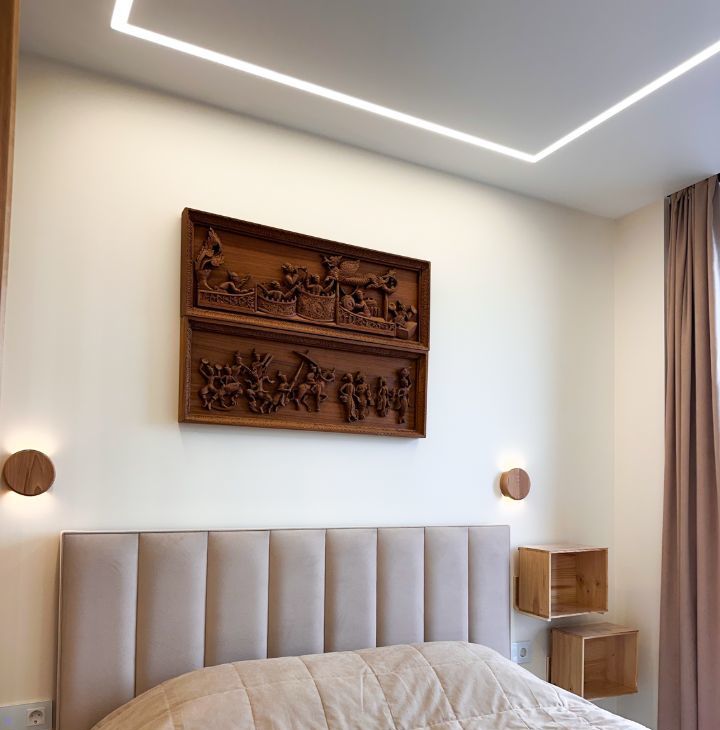 — Зона отдыха: двуспальная кровать, телевизор, журнальный столик, полочки для хранения
