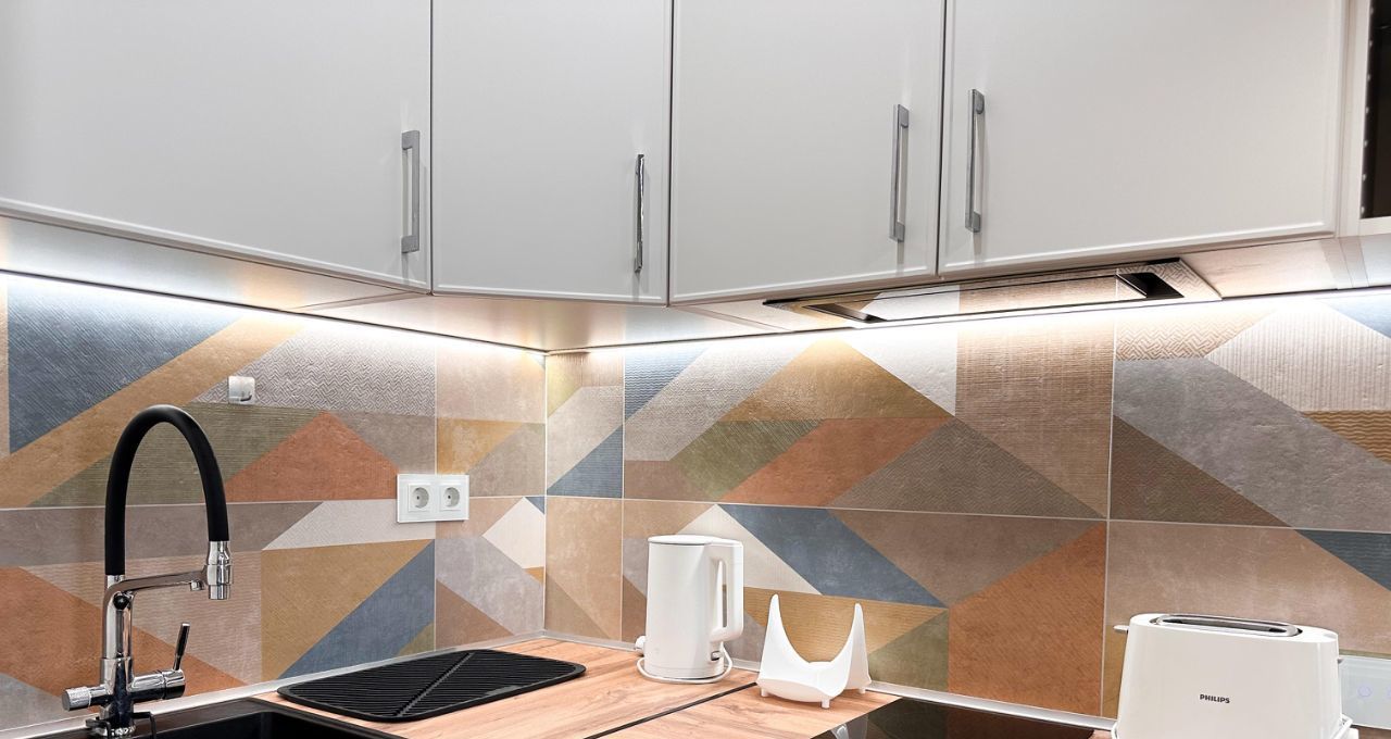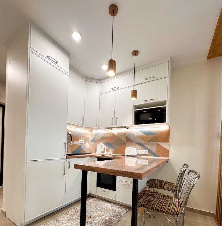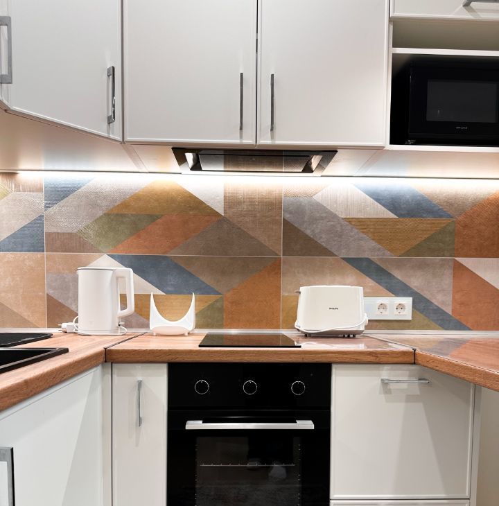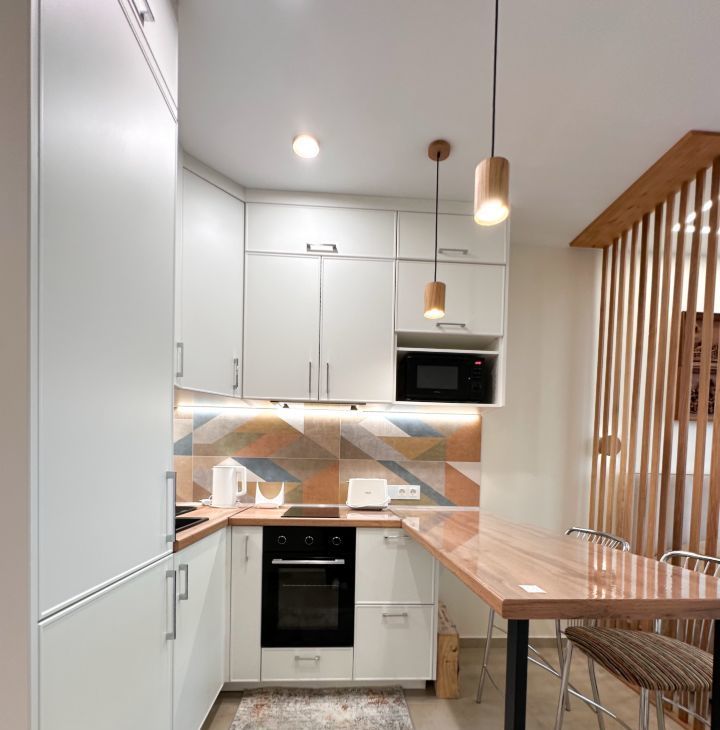 — Техника: варочная панель на 2 конфорки, духовой шкаф, вытяжка, холодильник, чайник, тостер, микроволновка