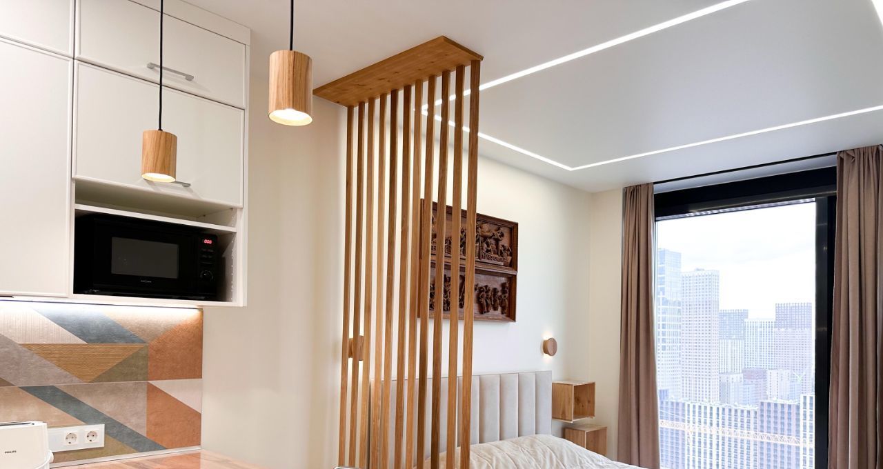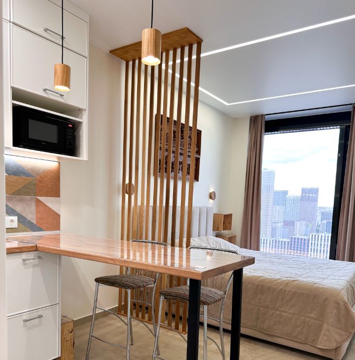 Сдаётся стильная студия премиум-класса с дизайнерским ремонтом и панорамным видом на город. Квартира полностью готова к заселению — всё новое, продумано до мелочей для комфортной жизни. Сдаётся впервые.