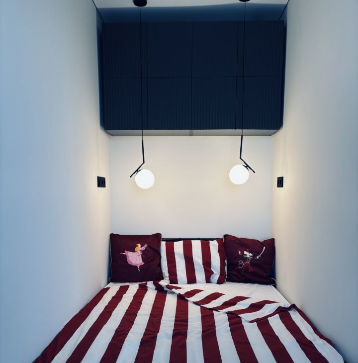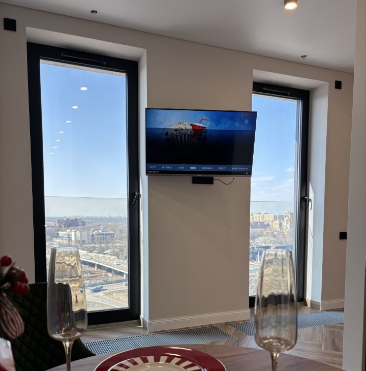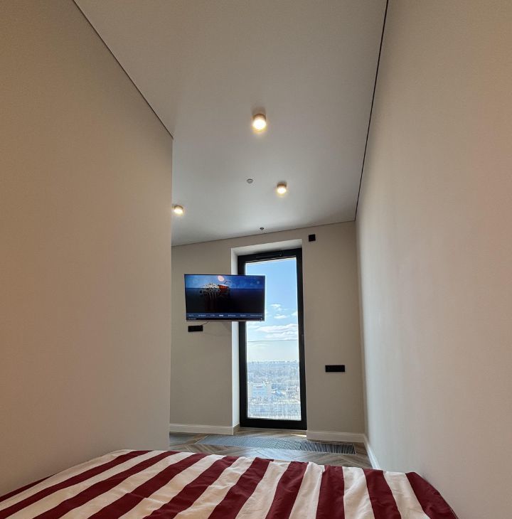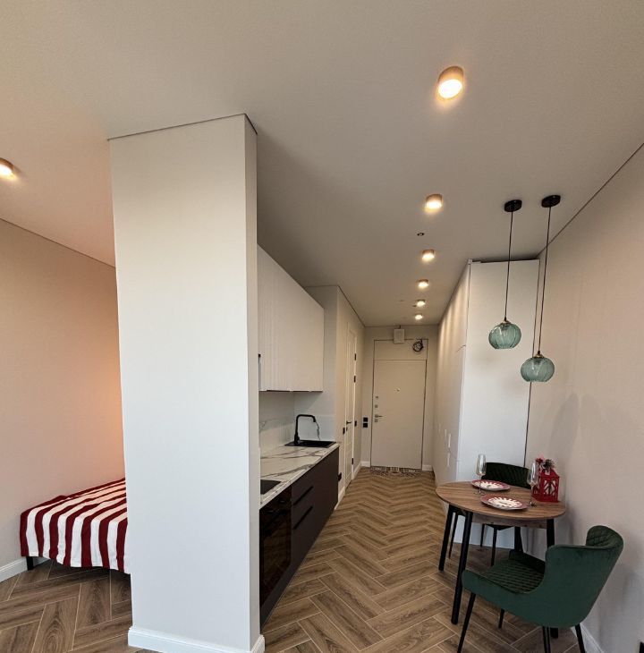 В студии тщательно продуман функционал и эргономика пространства. Комната зонирована перегородкой на спальную, кухонную и гостиную зону с панорамными окнами. Оборудованы вместительные гардеробные шкафы.