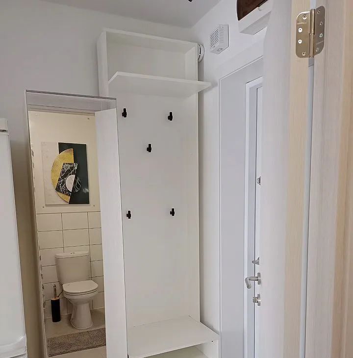 В прихожей холодильник, шкафчик с зеркалом в полный рост, шкафчик с крючками под верхнюю одежду и обувницей внизу.
