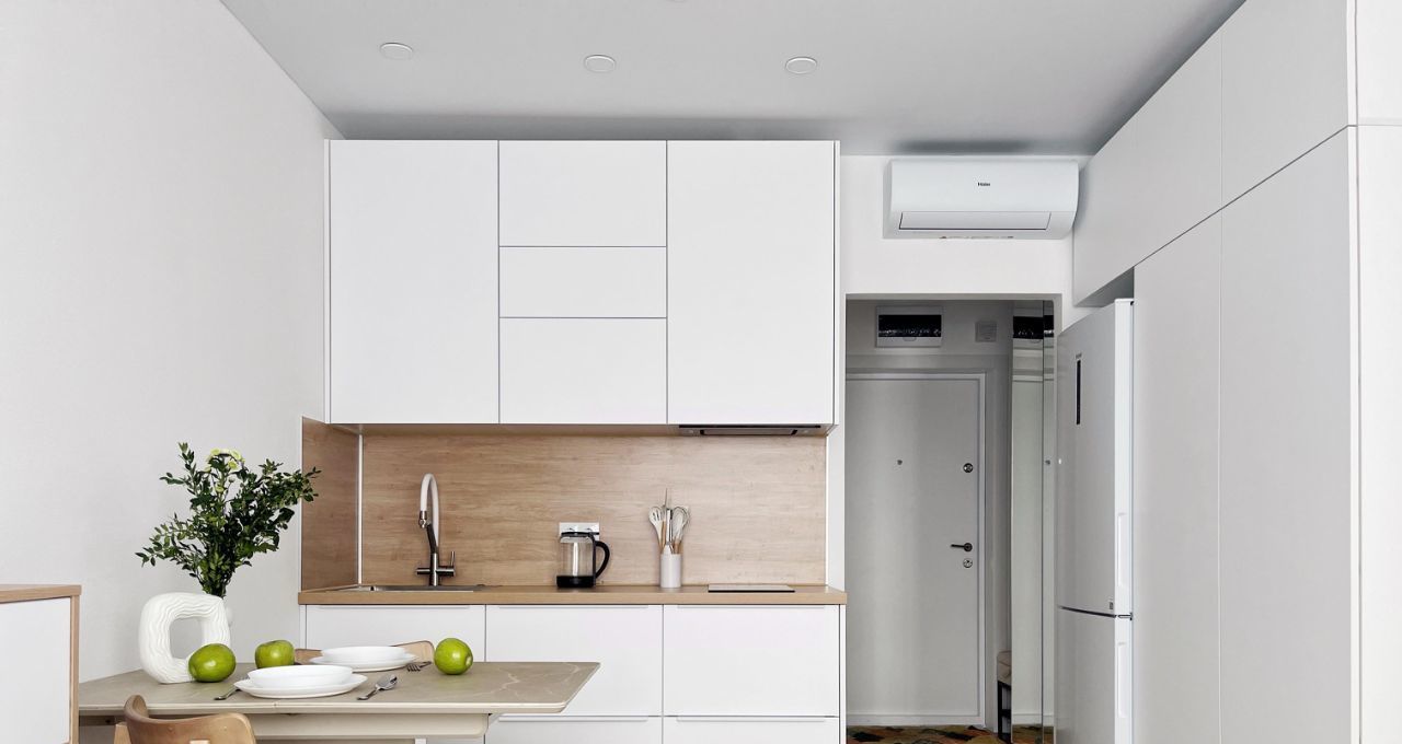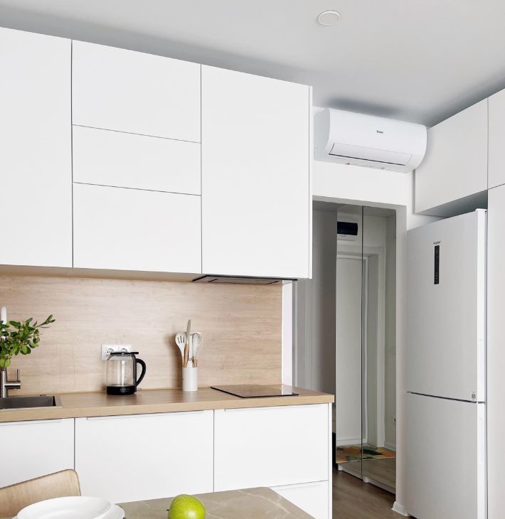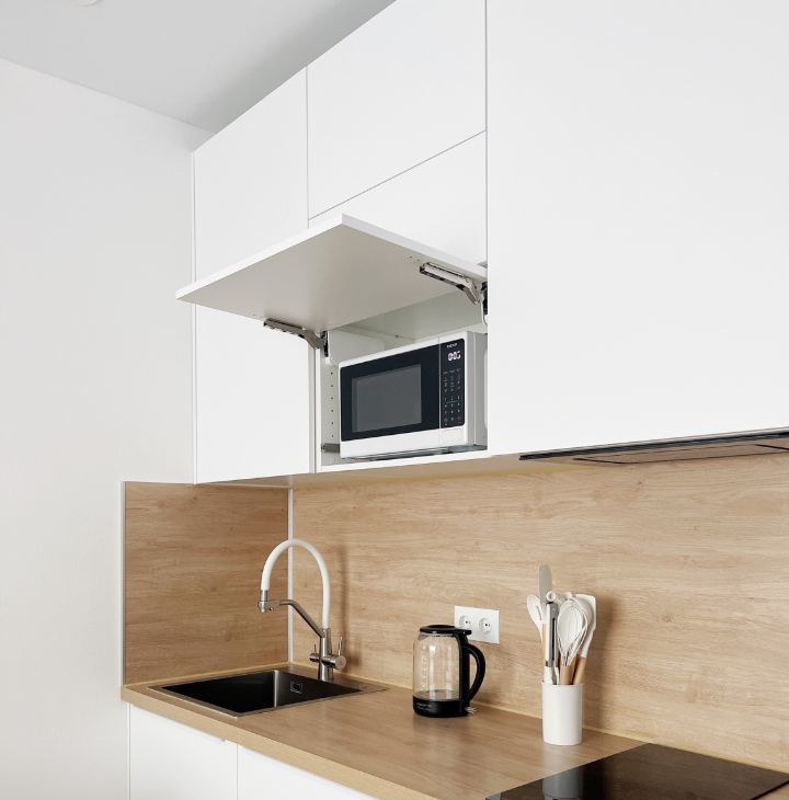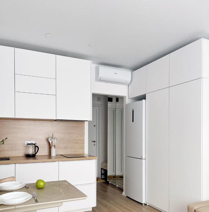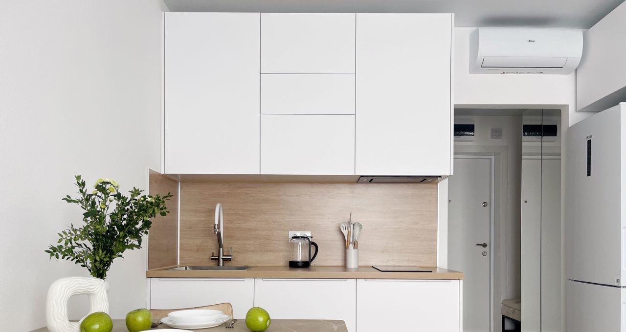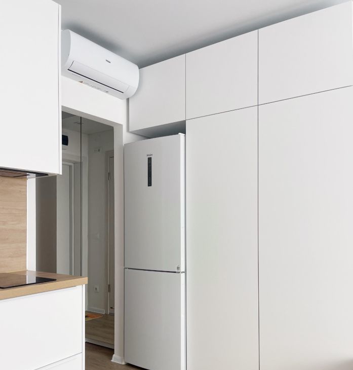 Бытовая техника: холодильник, СВЧ печь, варочная панель, электрический чайник, утюг, стиральная машина, кондиционер, полотенцесушитель, телевизор, пылесос.