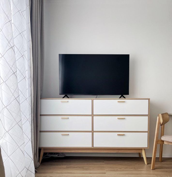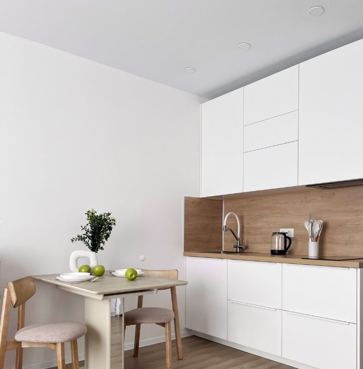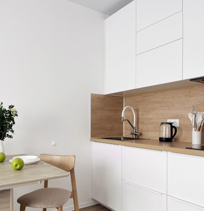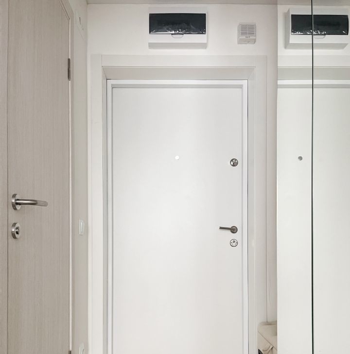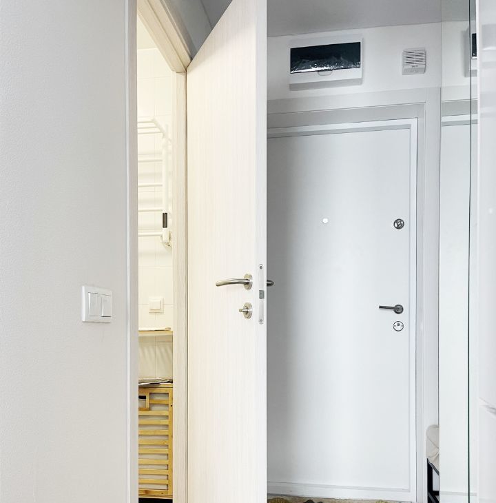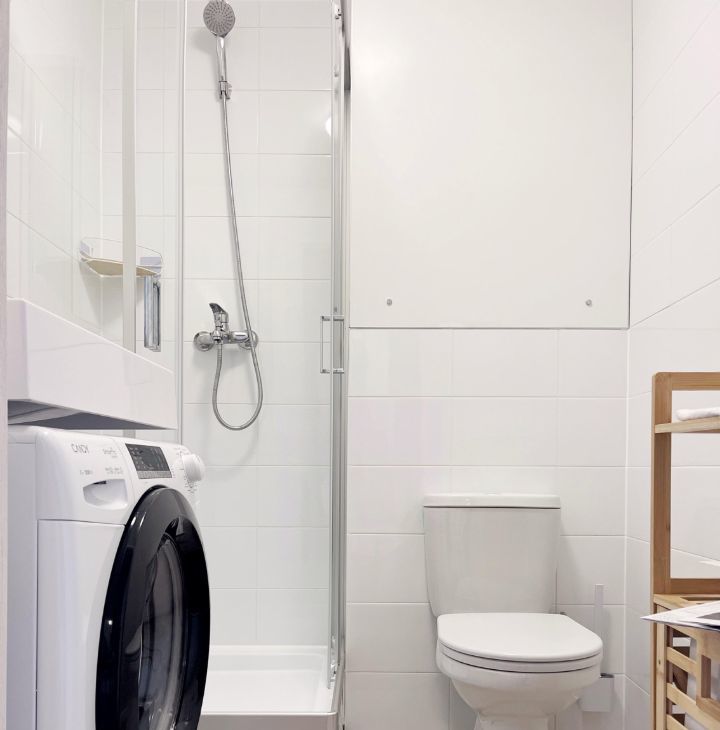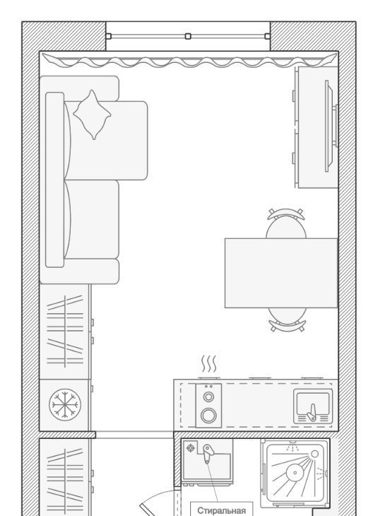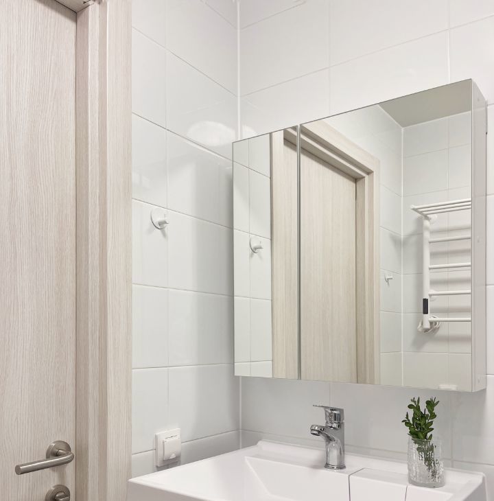 Бытовая техника: холодильник, СВЧ печь, варочная панель, электрический чайник, утюг, стиральная машина, кондиционер, полотенцесушитель, телевизор, пылесос.