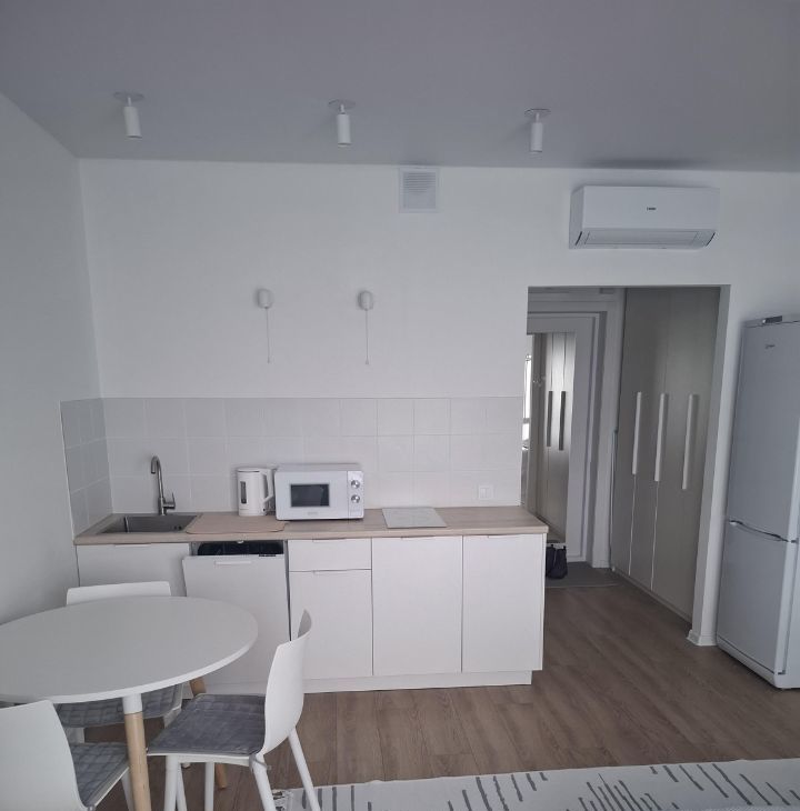 Уютная и светлая студия 24кв. В квартире почти не жили, вся техника и текстиль (останется арендатору) новые. Есть ПММ (посудомоечная), кондиционер, СВЧ-печь (микроволновка), стиральная, холодильник, чайник, роутер, пылесос, зеркало в пол / ростовое, шторы блэкаут, много источников света.