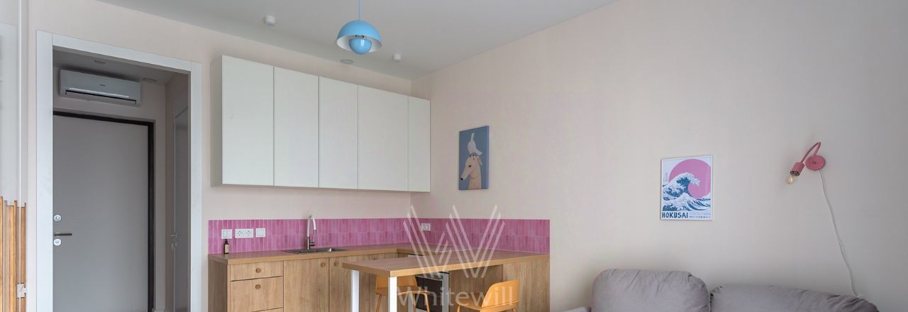 Студия общей площадью 24 м² в комплексе бизнес-класса "Павелецкая Сити" в Даниловском районе. Квартира с отделкой расположена на 26 этаже. В интерьере гармонично сочетаются светлые тёплые оттенки и фактура дерева. Акцентные детали в светло-розовых и голубых тонах добавляют индивидуальности. Квартира меблирована и укомплектована бытовой техникой Weissgauff и Candy, установлен кондиционер. Благодаря панорамному окну пространство наполнено светом, открывается вид на город и Москву-реку.