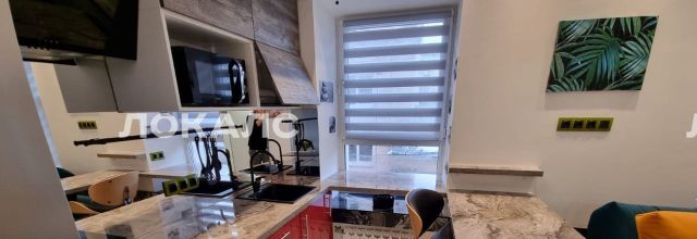 В студии недавно сделан дизайнерский ремонт. Пространство организовано максимально эффективно: есть вся необходимая мебель как на кухне, так и в комнате. Здесь же установлена современная техника: кондиционер, холодильник, телевизор и стиральная машина. Ванная комната оборудована душевой кабиной.