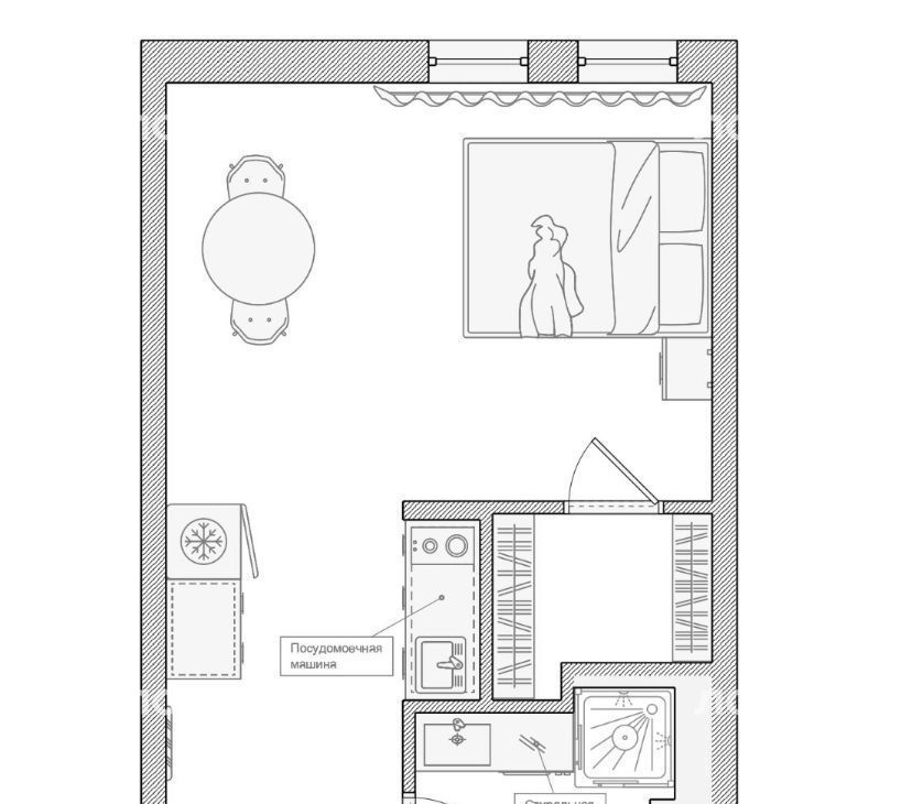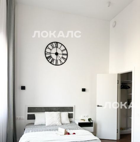 В спальной зоне просторная кровать. Также есть гардеробная для хранения вещей, имеется стиральная машина.