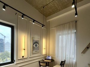 В квартире выполнен качественный евроремонт. Пространство грамотно зонировано, что создает комфортную атмосферу для работы и отдыха в квартире. В студии есть вся необходимая мебель: стильный диван с местами для хранения, двуспальная кровать, современная кухня из массива со встроенной техникой, а из техники — кондиционер, холодильник , вытяжка, варочная панель, духовой шкаф, эл чайник и стиральная машина. Санузел совмещенный, оборудован современным тропическим душем, местами для хранения косметических средств Окна выходят во двор, что обеспечивает тишину и спокойствие. Также подключен интернет, что позволяет оставаться на связи.