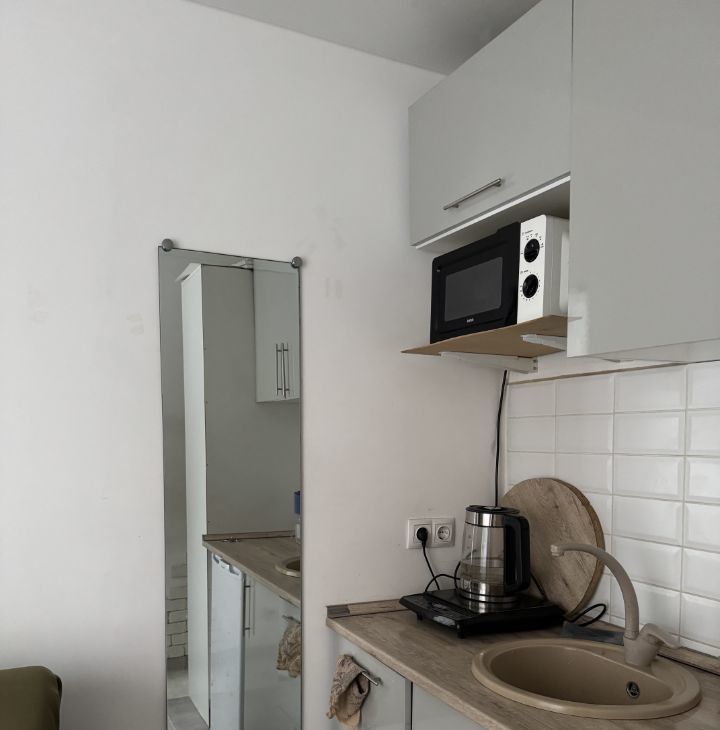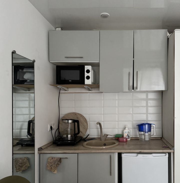 Сама квартира очень небольшая, но приспособленная для жизни) Есть индукционная плита, электрический чайник, сушилка для белья, стиральная машинка, микроволновка.