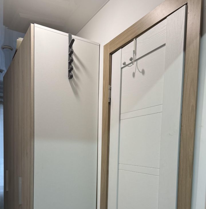 Несмотря на размер, много места для хранения: большой шкаф, кухонные шкафы, крючки для верхней одежды